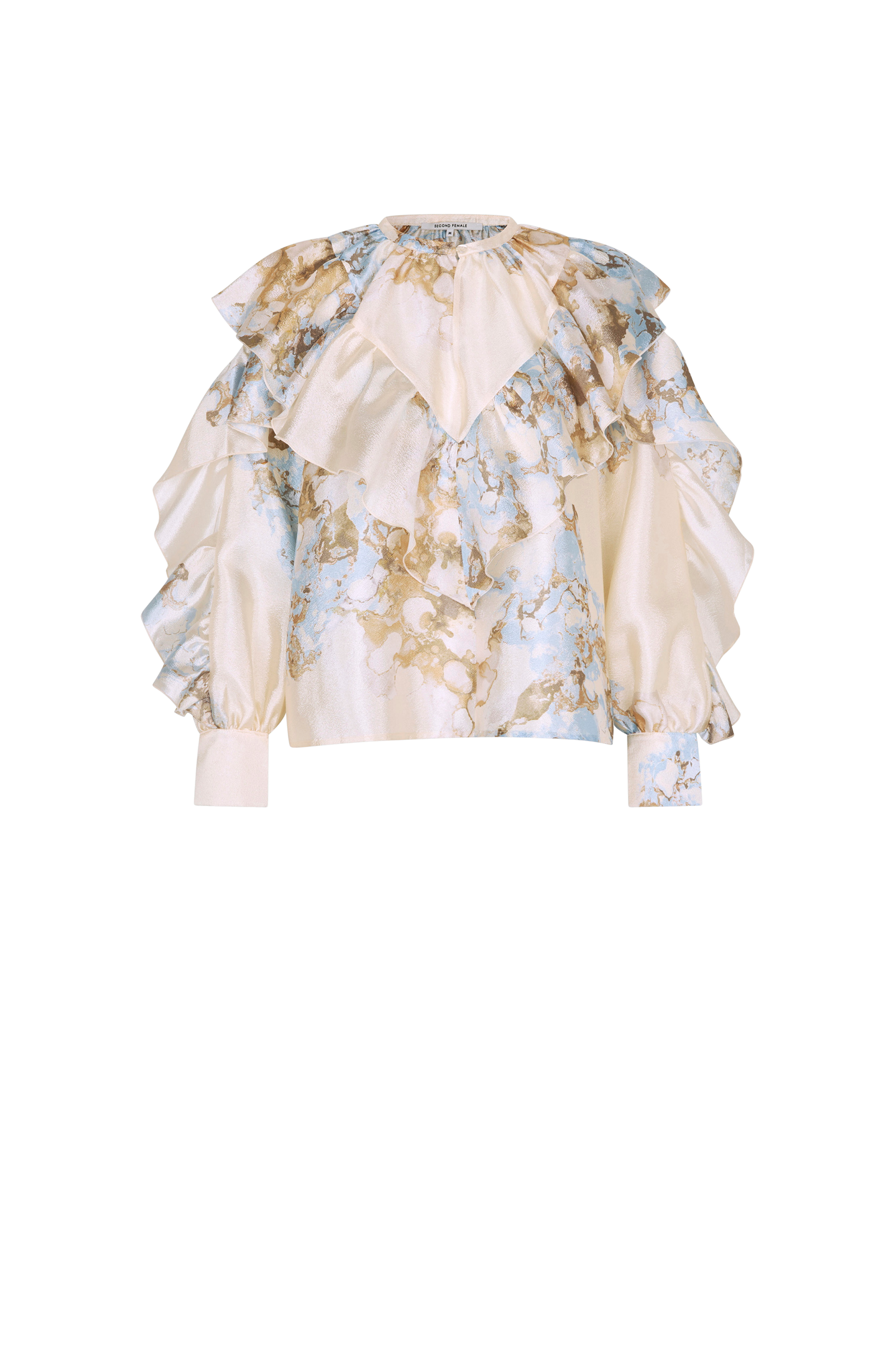 • Semitransparent bluse med glitter• Volang foran, over skuldrene, oppover ryggen og langs med ermene• Rund hals med nøkkelhulsåpning og knapp• Rysje rundt halsen• Lange ermer med mansjetter