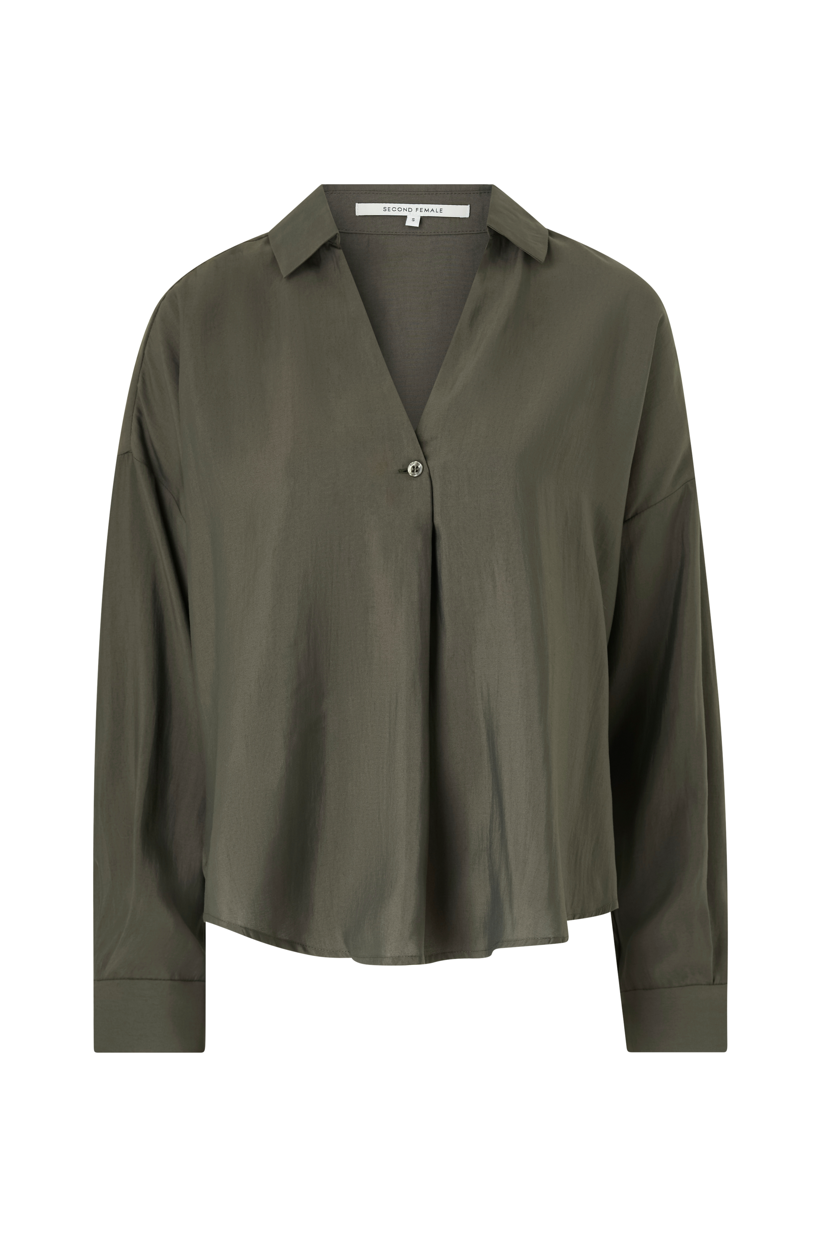 • Bluse med avslappet passform• V-formet hals med krage og dekorativ knapp på bunnen• Lange ermer med utringede skuldre og mansjetter i ermeslutten• Avrundet hem med skjær i sidene