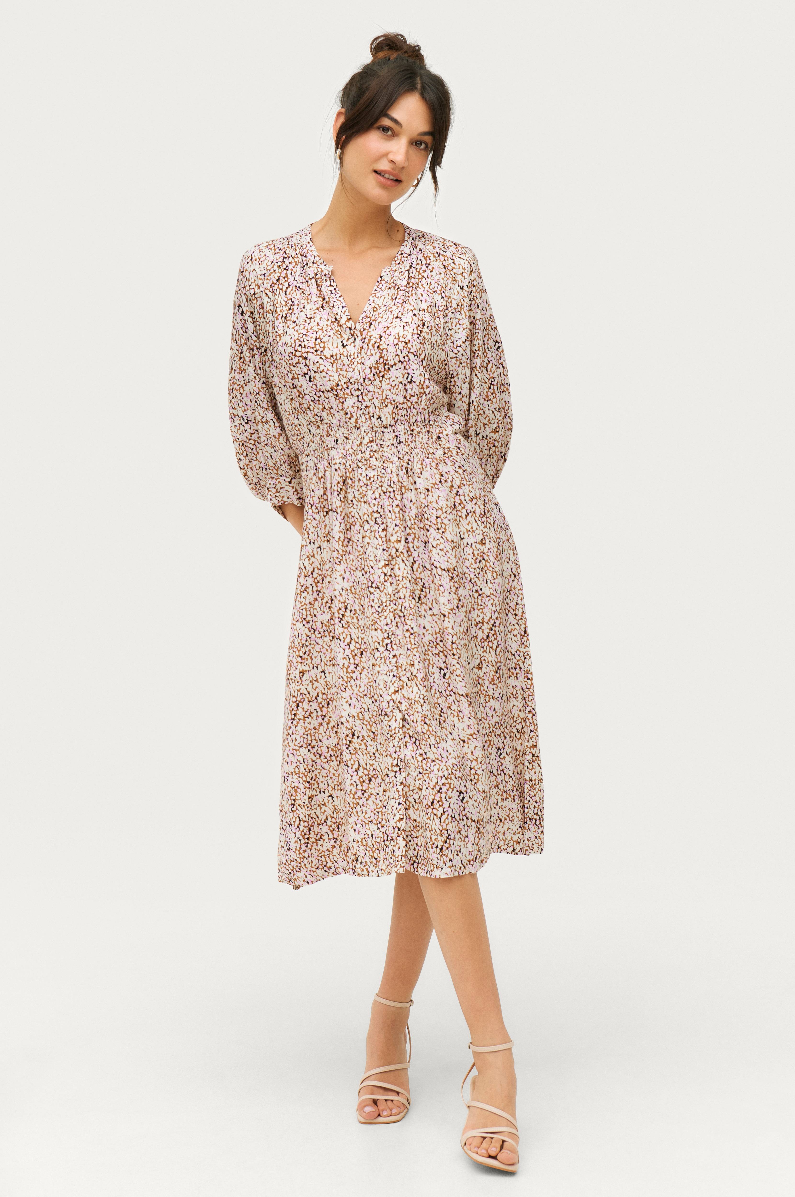• V-hals snitt• Stoffdekkede knapper• Vaffelsøm ved midjen• Armer 3/4 lang med mansjett• Splitt i sidene• Laget av tynn, myk viskose• Fôret• Lengde: 111 cm i størrelse S