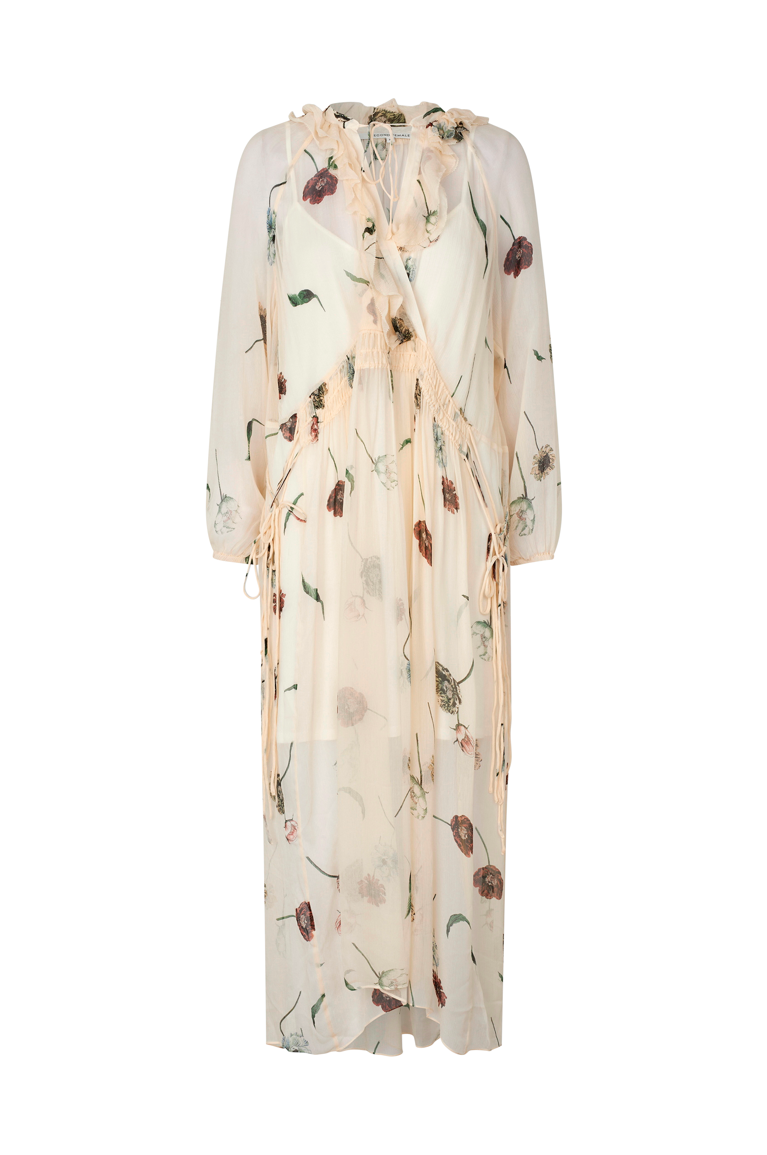• Lang, gjennomsiktig kjole med uttagbart underskjørt• Rund halsringning• Splitt med knytbar tråd foran• Dekorative volanger• Lange raglanermer• Snøring ved midjen• Lengde: 130 cm i størrelse S