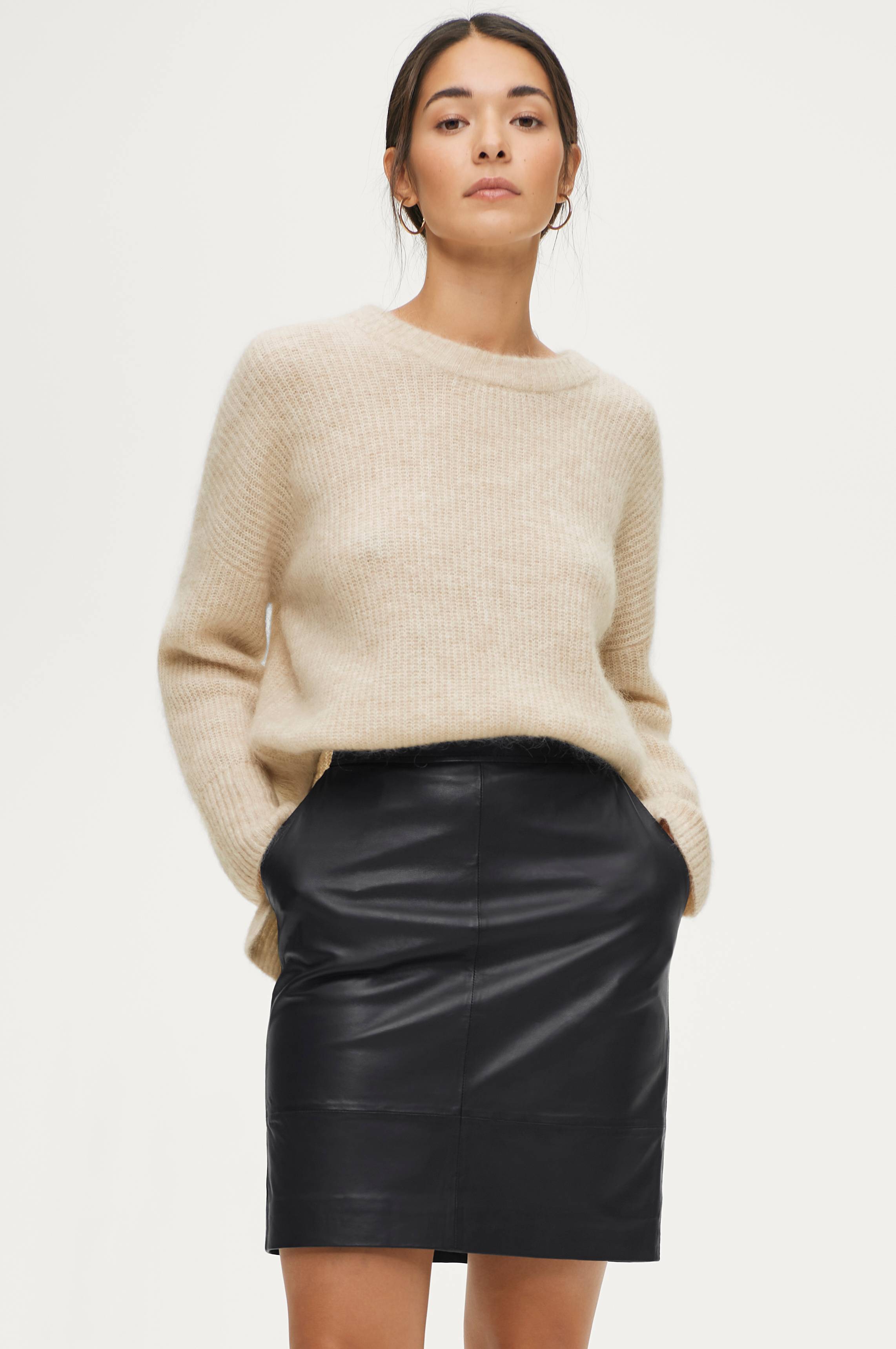 Skinnskjørt Francie Mini Leather Skirt fra Second Female i mykt skinn med vevd fôr. Lommer i sidene, og skjult glidelås og trykknapp bak. Lengde ca. 52 cm i str S.