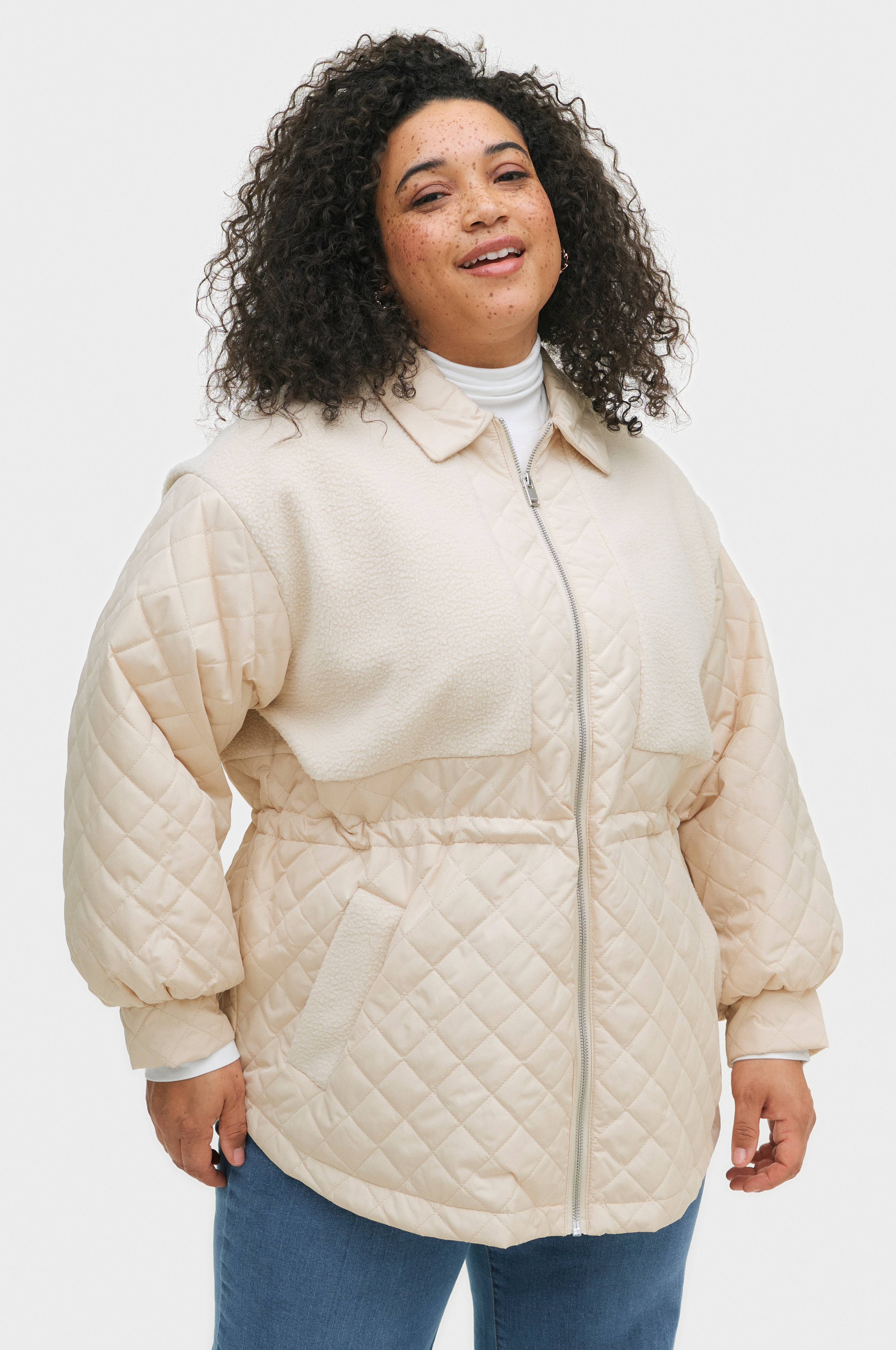 • Vattert jakke med tynn polstring • Teddy-material på toppen • Glidelås • Innvendig snøring ved midjen • Brede armer med mansjett • To lommer • Plusstørrelser • Lengde: 76 cm i størrelse 44