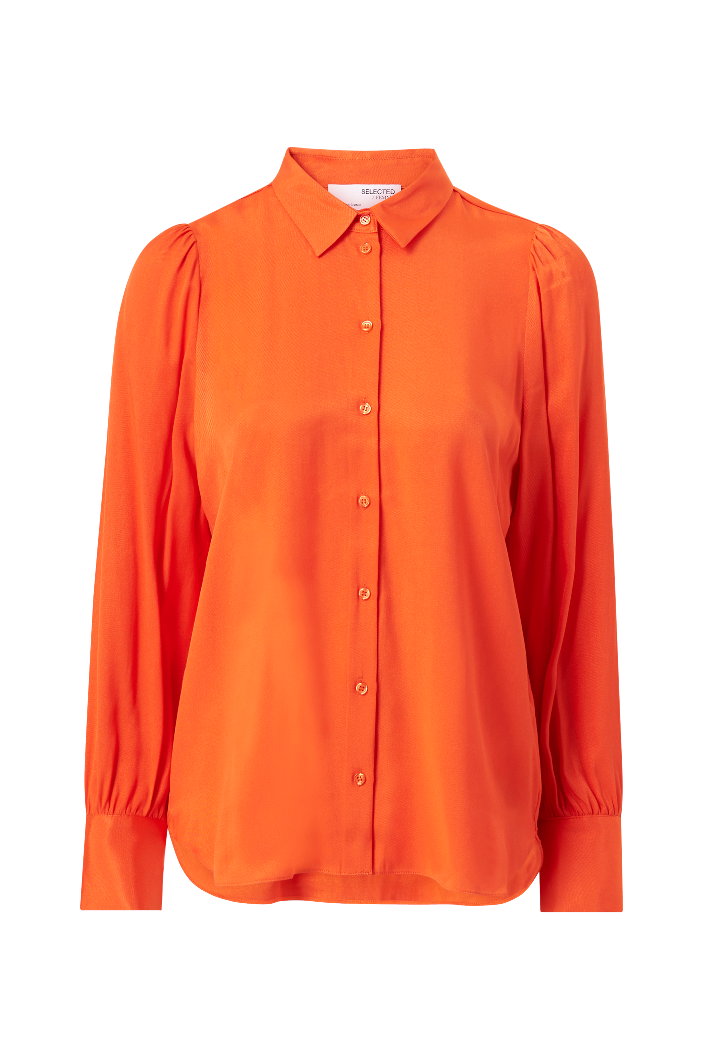 Skjortemodell med liten krage og knapper hele veien foran. Lange puffermer med bred mansjett i ermekantene. Avrundet nederkant med splitt i sidene.