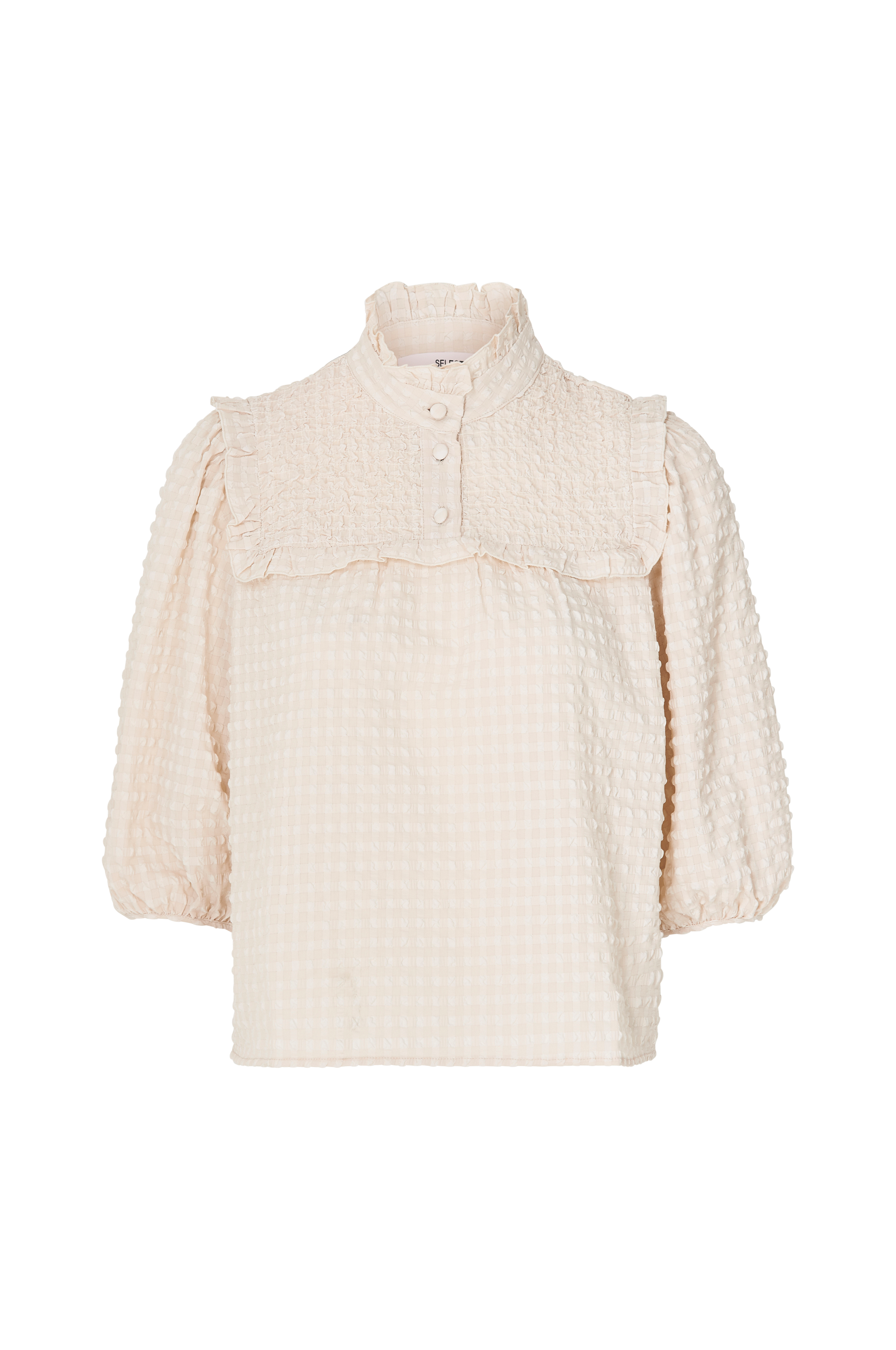 • Ballongermer 3/4 lang med kantbånd i ermeslutten • Ståkrage med volang • Stoffdekkede knapper oppover foran • Vaffelsøm med volang på toppen • Strukturmønstret kvalitet • Produktet inneholder gjenvunnet materiale som er brukt for å redusere mengden avfall, samtidig som det ikke er brukt nye ressurser.
