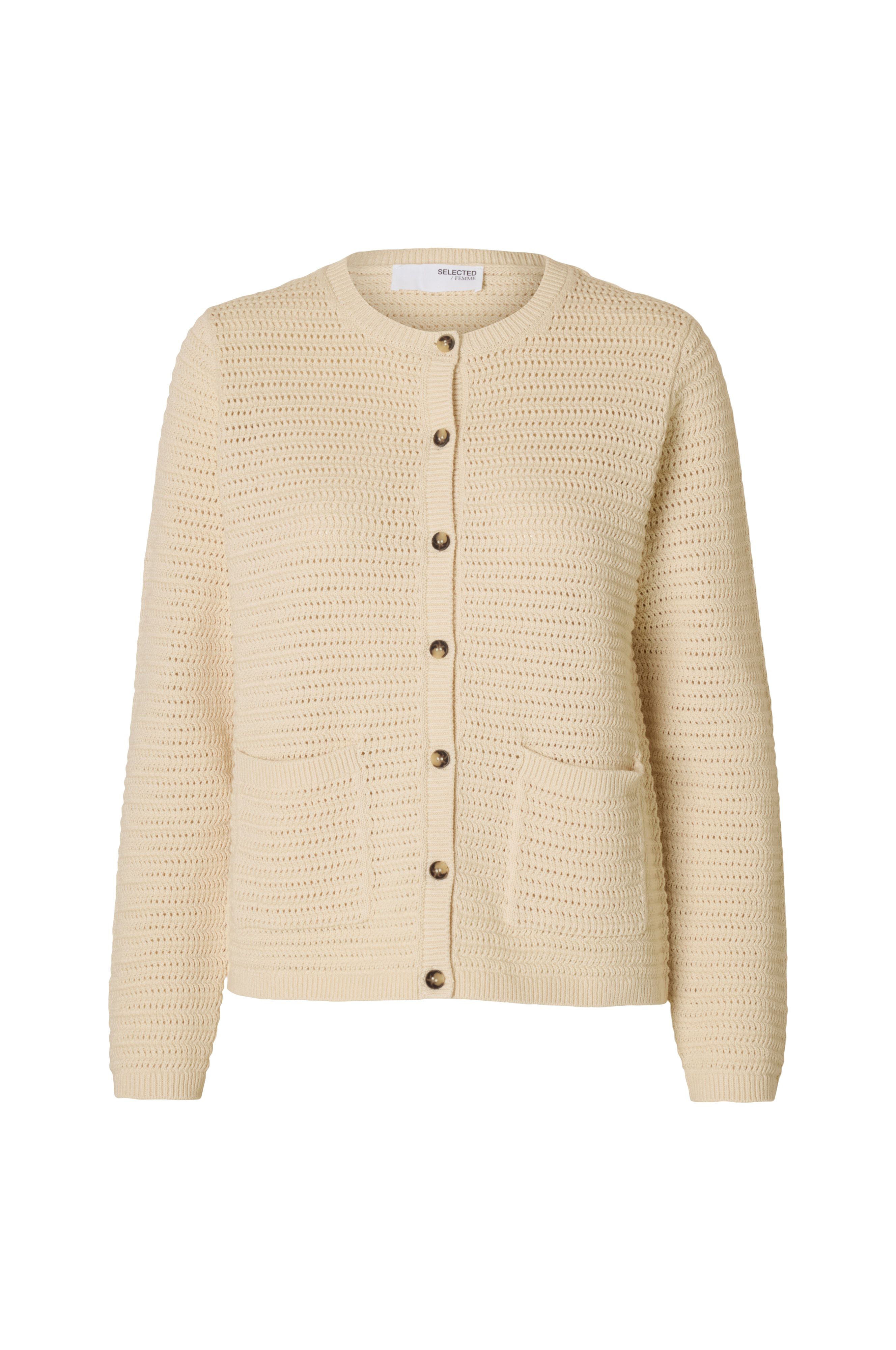 • Strukturmønstret modell• Rund hals• To lommer• Langt erme• Ribbestrikkede kanter