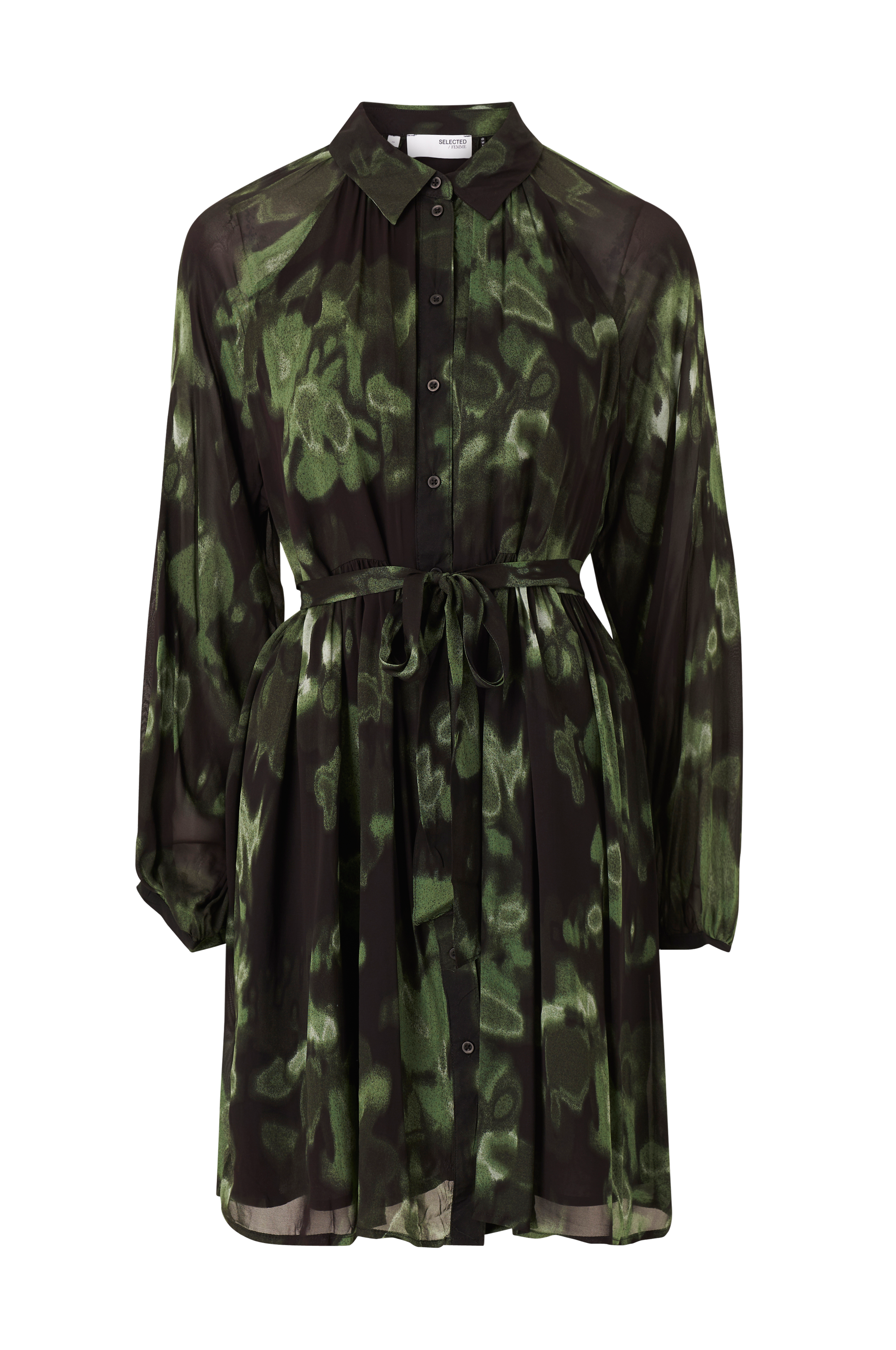 • Utsvingt modell i chiffon• Liten krage med avtagbar knytbar tråd i halsen• Knappstolpe hele veien fram• Langt raglanerme med tynn mansjett• Definert midje med rysje• Fôret• Lengde: 94 cm i størrelse 36