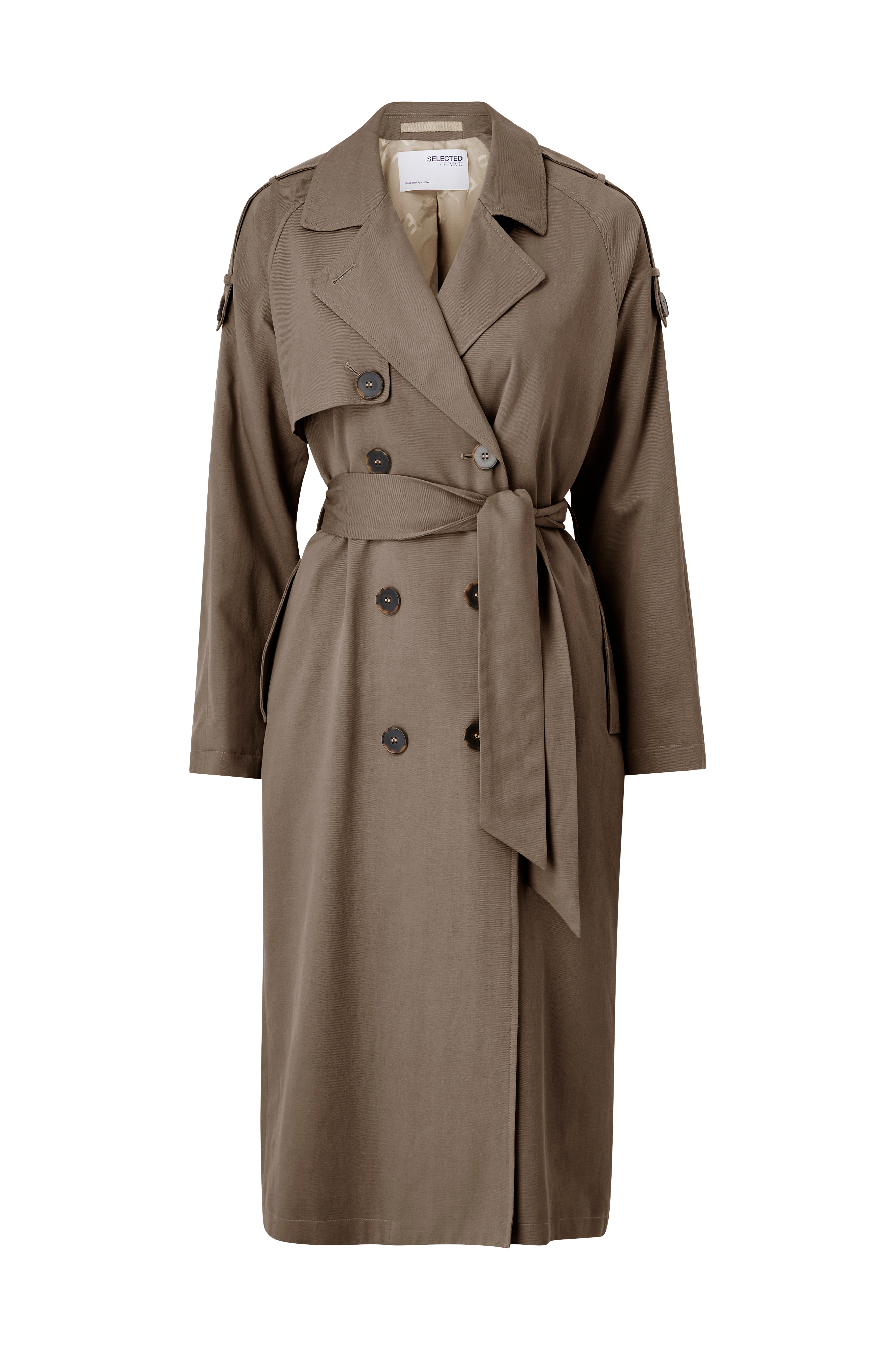 Trenchcoat i lang modell med knappedetaljer på skuldrene og foran. Enkeltspent med doble knapperader. To lommer og knytebelte i midjen. En innerlomme. Løst hengende bærestykke bak med to knapper. Høy splitt nederst bak. Lengde ca. 120 cm i str 36.