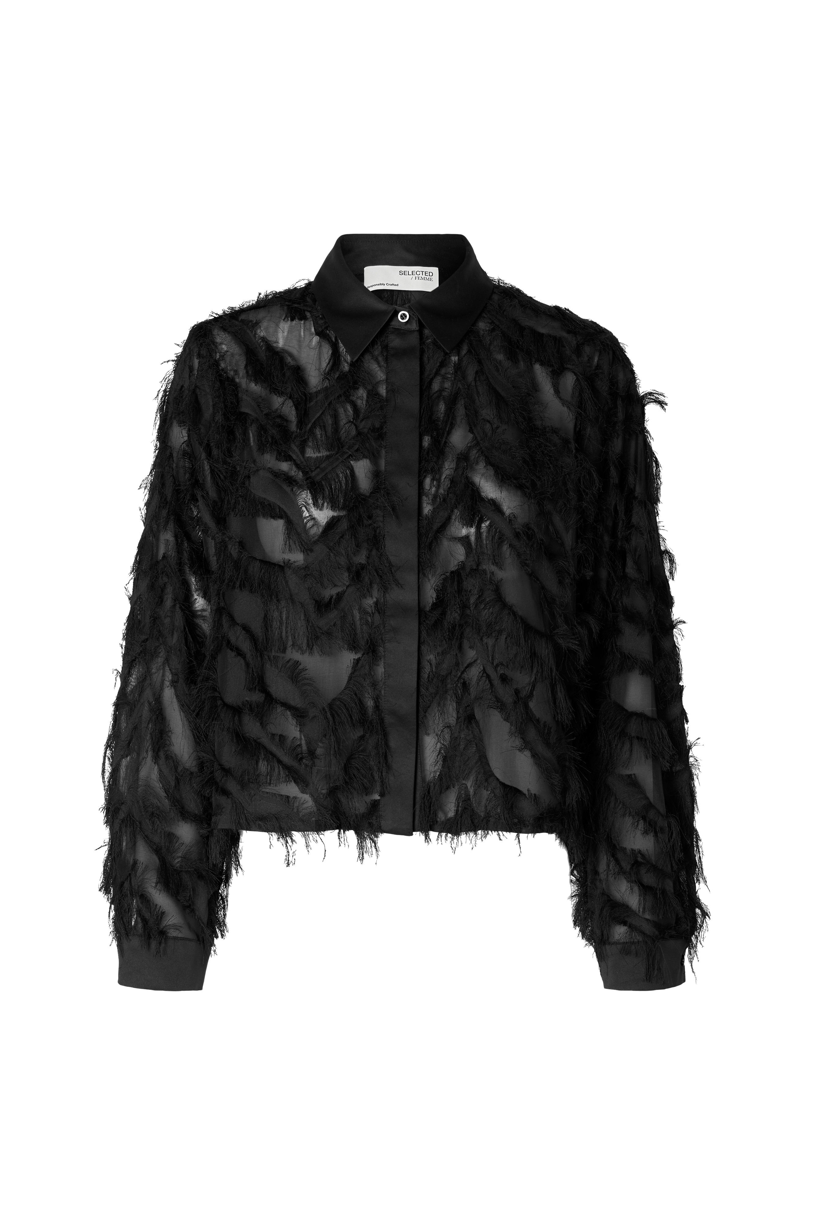 • Rett modell i chiffon med tynne frynser overalt• Krage i sateng• Skjulte knapper hele veien fram• Langt erme med mansjett• Hem med et rettvinklet snitt
