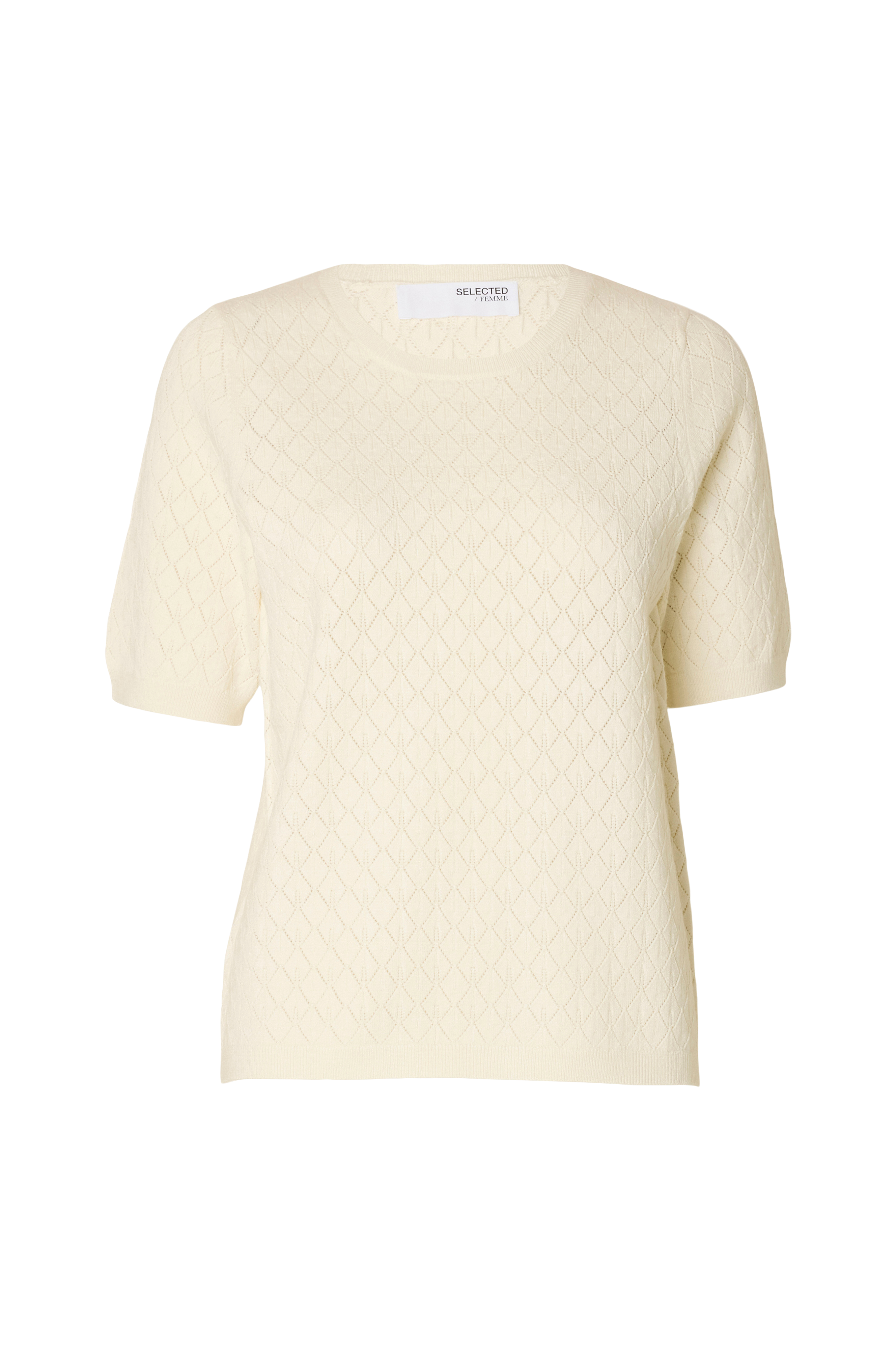 • Rett, mønsterstrikket modell• Rund hals med liten ribbet kant• Kort erme• Smal ribbestrikk på bunnen og i ermeslutten