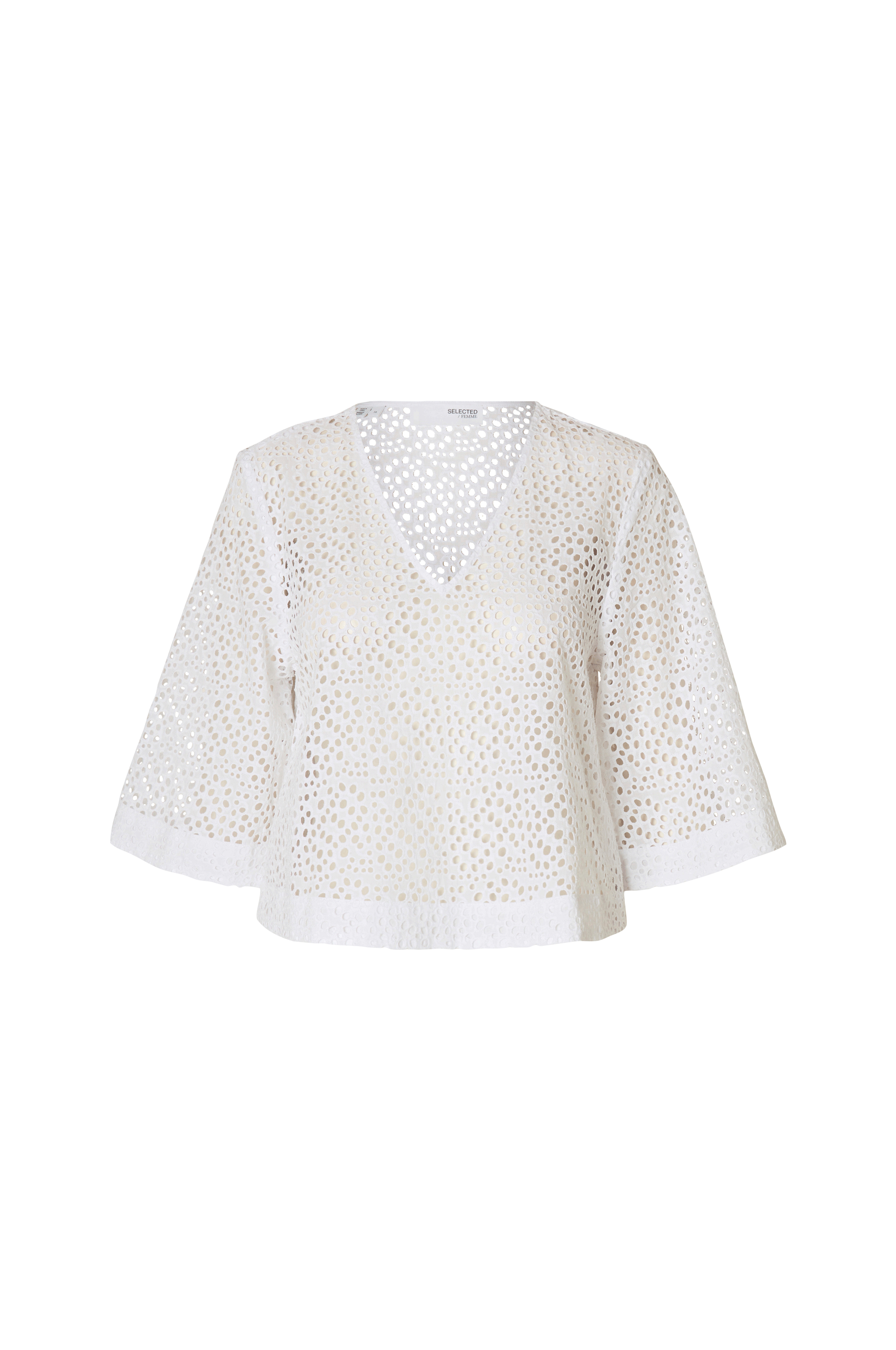 • Semitransparent topp med hullbroderier overalt• V-formet hals• Halvlange ermer