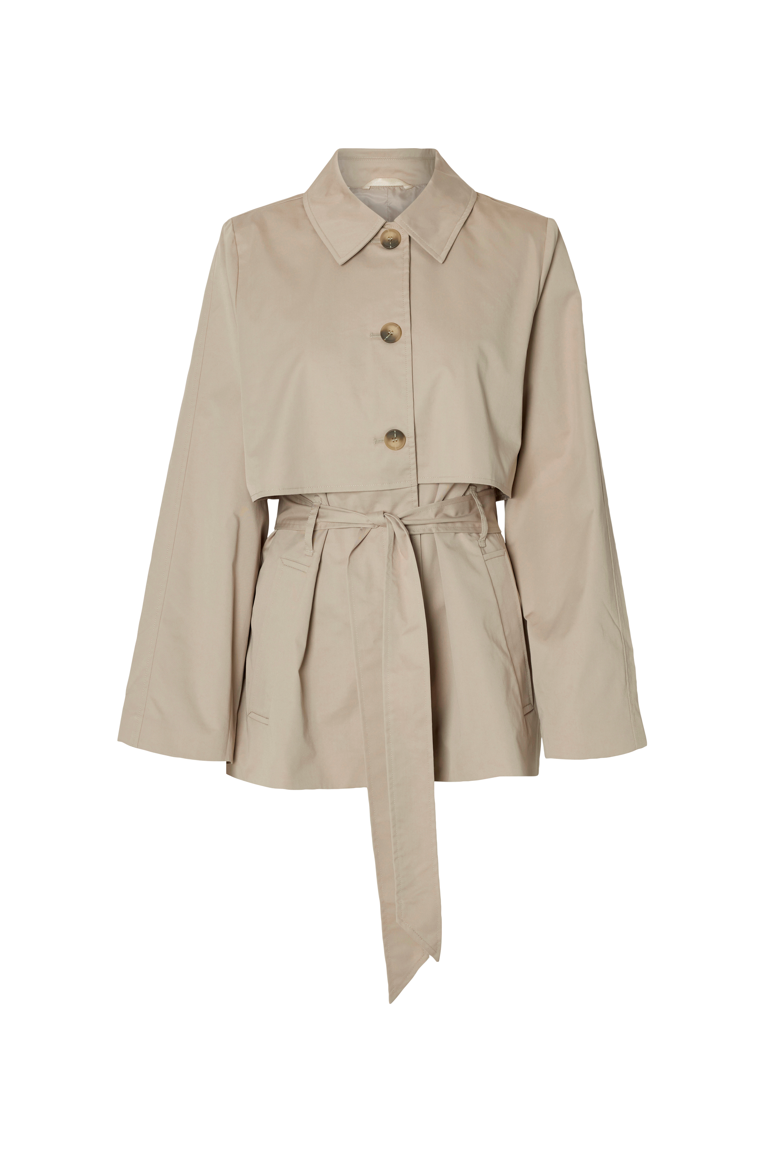 • Kort trenchcoat med krage• Knappelukking• Belte ved midjen• Sidelommer• Vevd, glatt foring• Innerlomme• Lengde: 77 cm i størrelse 36