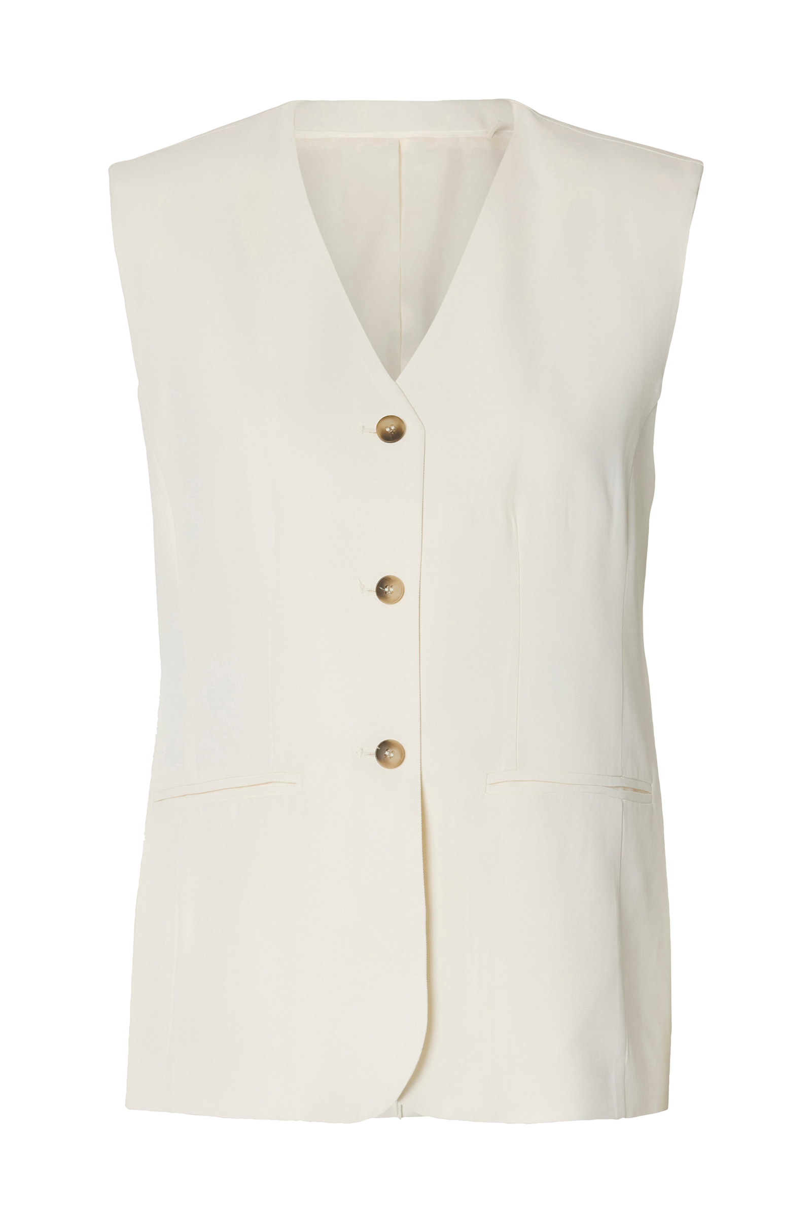 • V-hals snitt• Knappelukking• Delte lommer• Splitt bakpå• Foring i sateng
