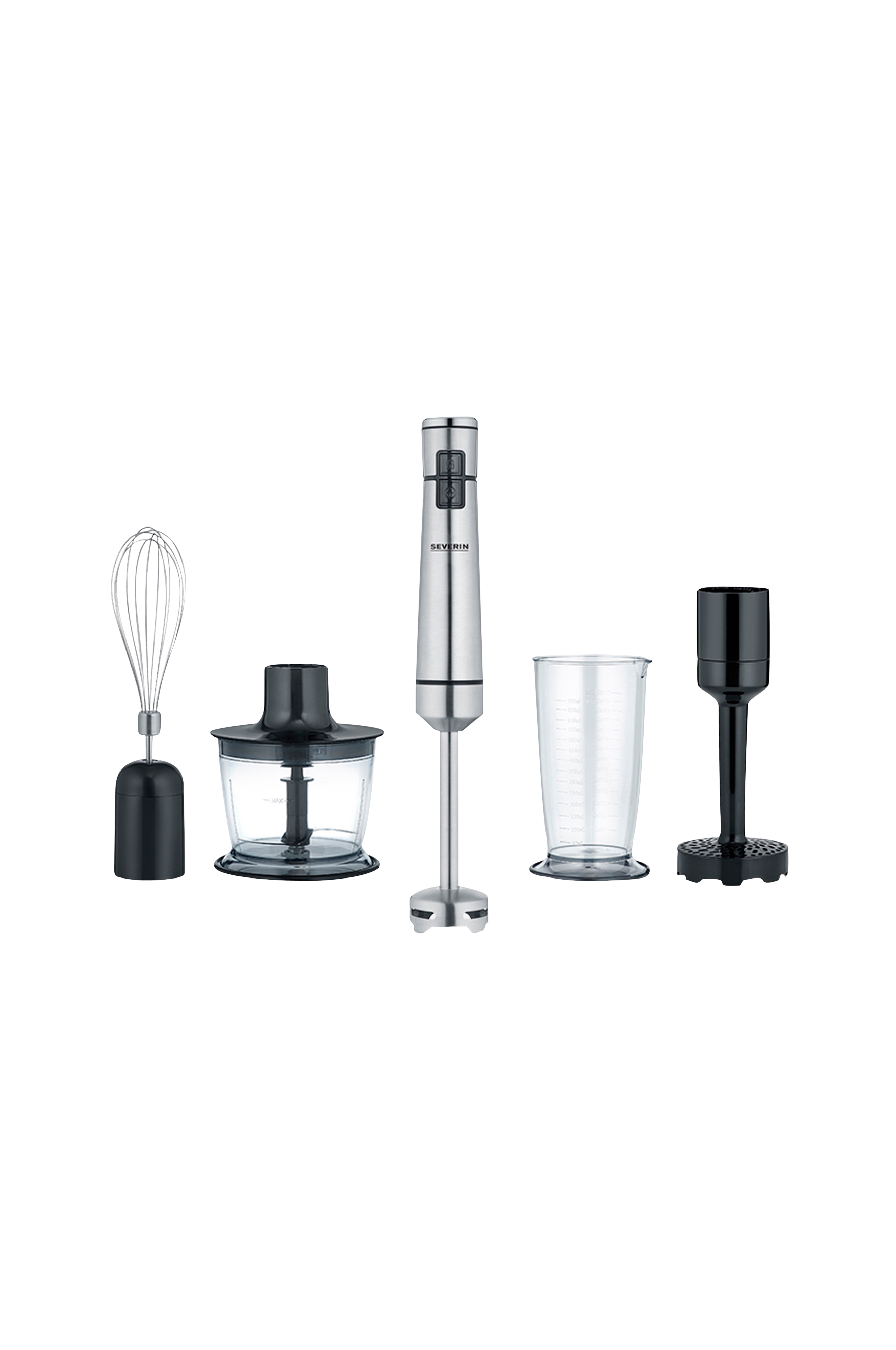 Oppladbart sett med stavmikser, ballongvisp, minihakker, potetstapper og blandebeger.