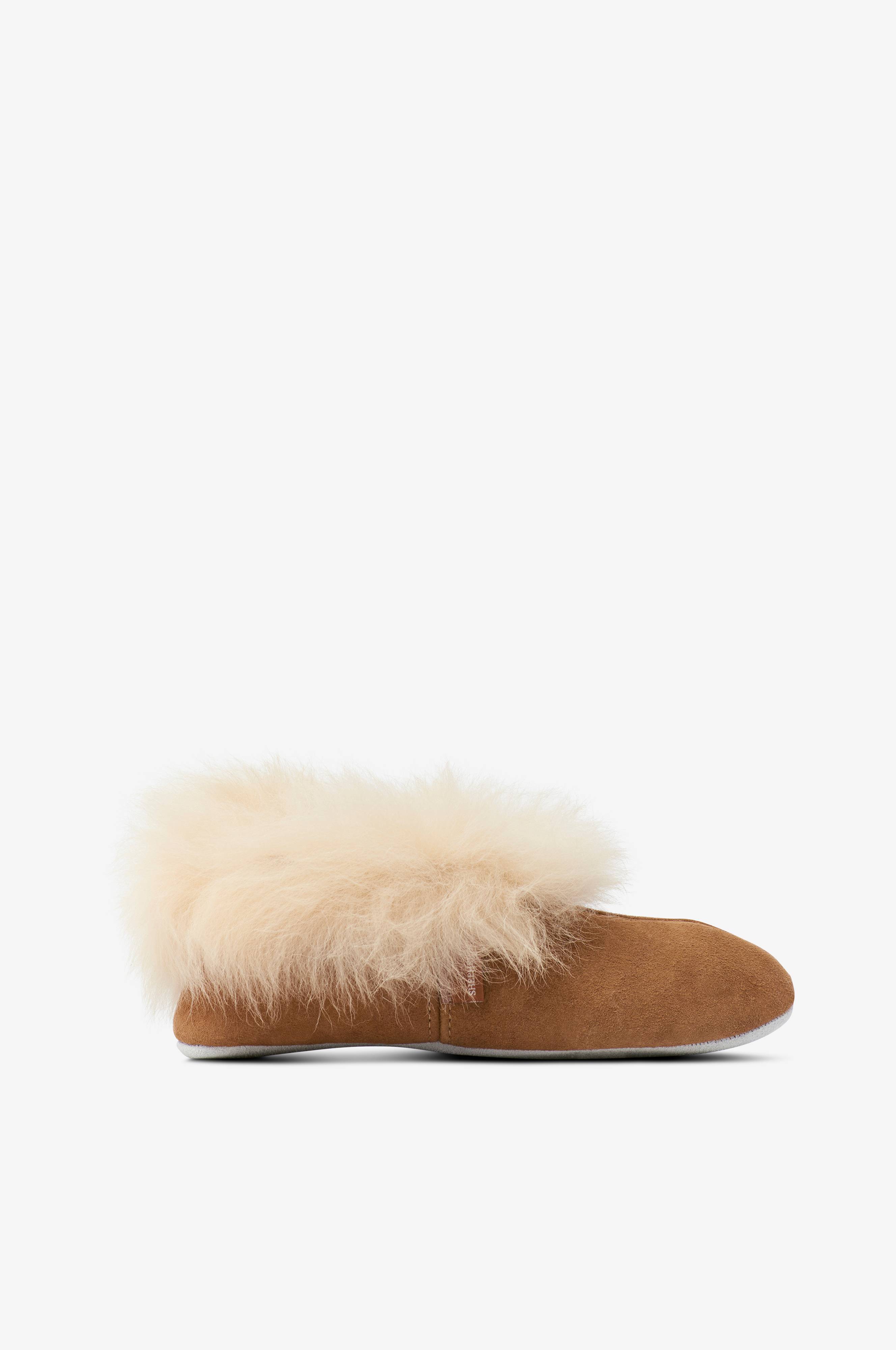 Saueskinnstøfler Annelie fra Shepherd er herlig tøfler i dra-på-modell i saueskinn som varmer og puster. Tøflene har lodden saueskinnskant. Tynn, smidig såle av semsket skinn.