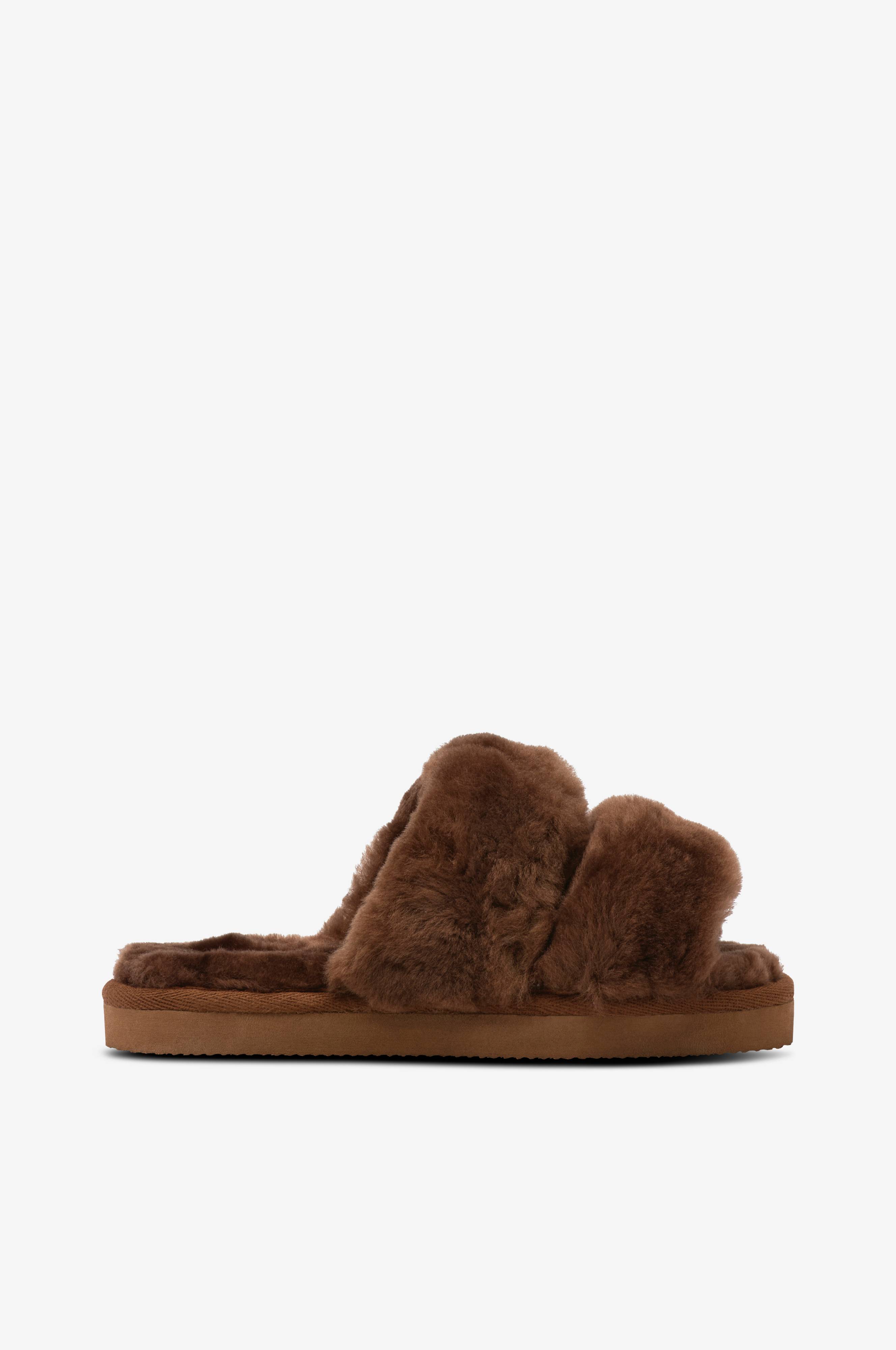 Myke saueskinnstøfler i trendy Slip on-modell. Modell med to brede remmer og åpen tå. Kantebånd i tekstil rundt sålen. Yttersåle i EVA slik at de med fordel også kan brukes utendørs.
