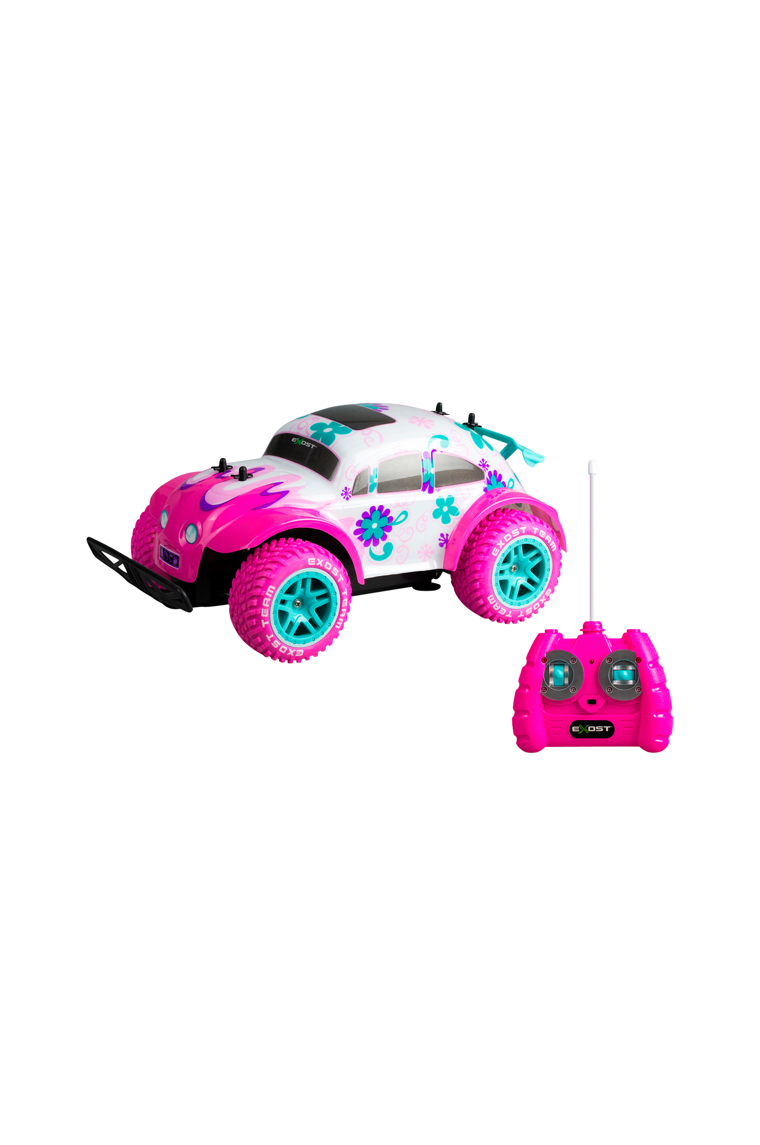 Exost Pixie er en radiostyrt bil med en fargerikt, rosa design med blomster. Heftig rc-bil som byr på en gøyal kjøreopplevelse i ulik terreng takket være de store dekkene. Exost Pixie har en toppfart på 12 km/t, så her går det unna. Du kan styre bilen i alle retninger. Karosseriet er avtagbart. Bilen leveres startklar inkludert batterier! Så det er bare å kjøre i gang det morsomme!