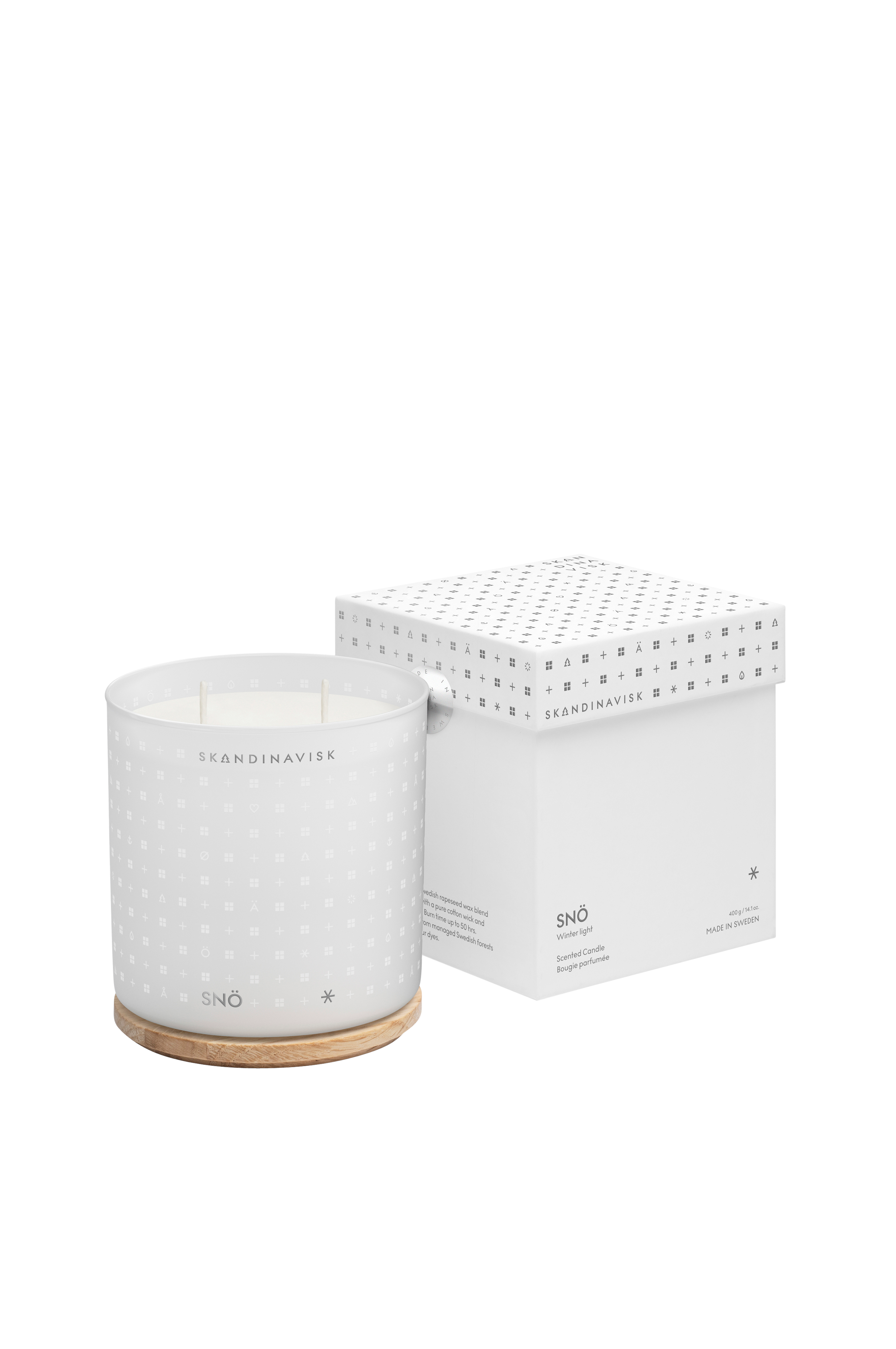 Duftlys med lokk av eik, produsert i Sverige med svensk rapsvoks og FSC-sertifisert gravert lokk i eik.