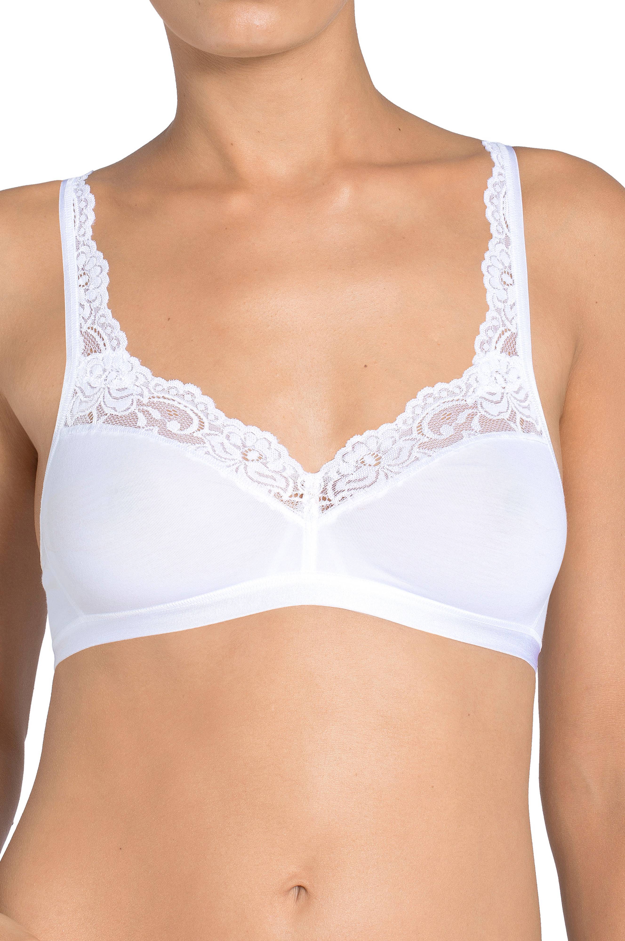 Skjønn bomullstrikot (55 % polyamid, 35 % bomull og 10 % elastan) som er meget lett og smidig med bra passform og holdbarhet. Slip-in modell med formpressede cuper. Vakker elastisk blonde som sitter fint rundt bysten. Finnes i hvit (60° finvask) og sort (40° finvask).