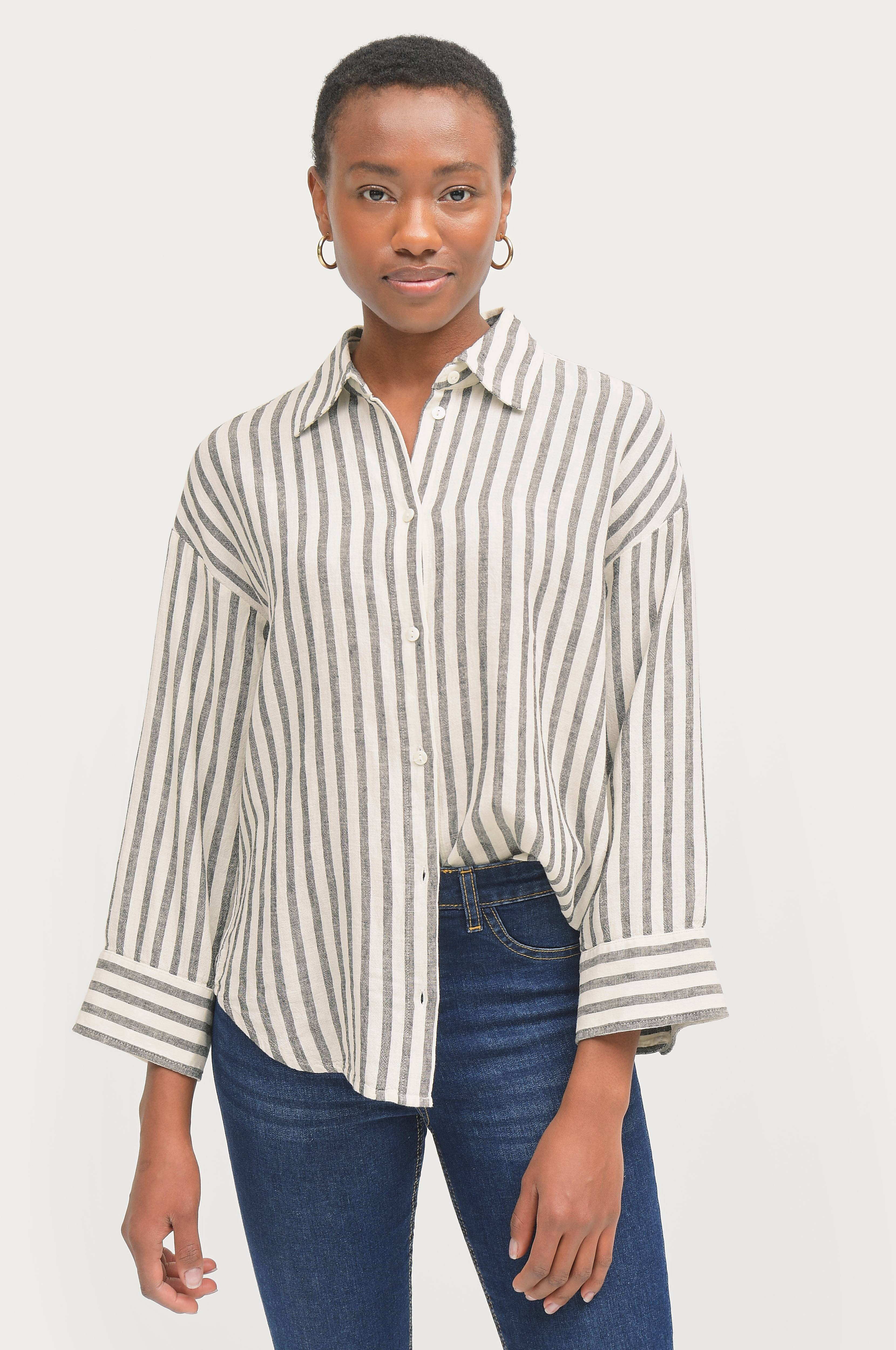 • Bluse i linmiks• Knapper foran• Knapp i ermeslutten• Lang backing med avrundet hem