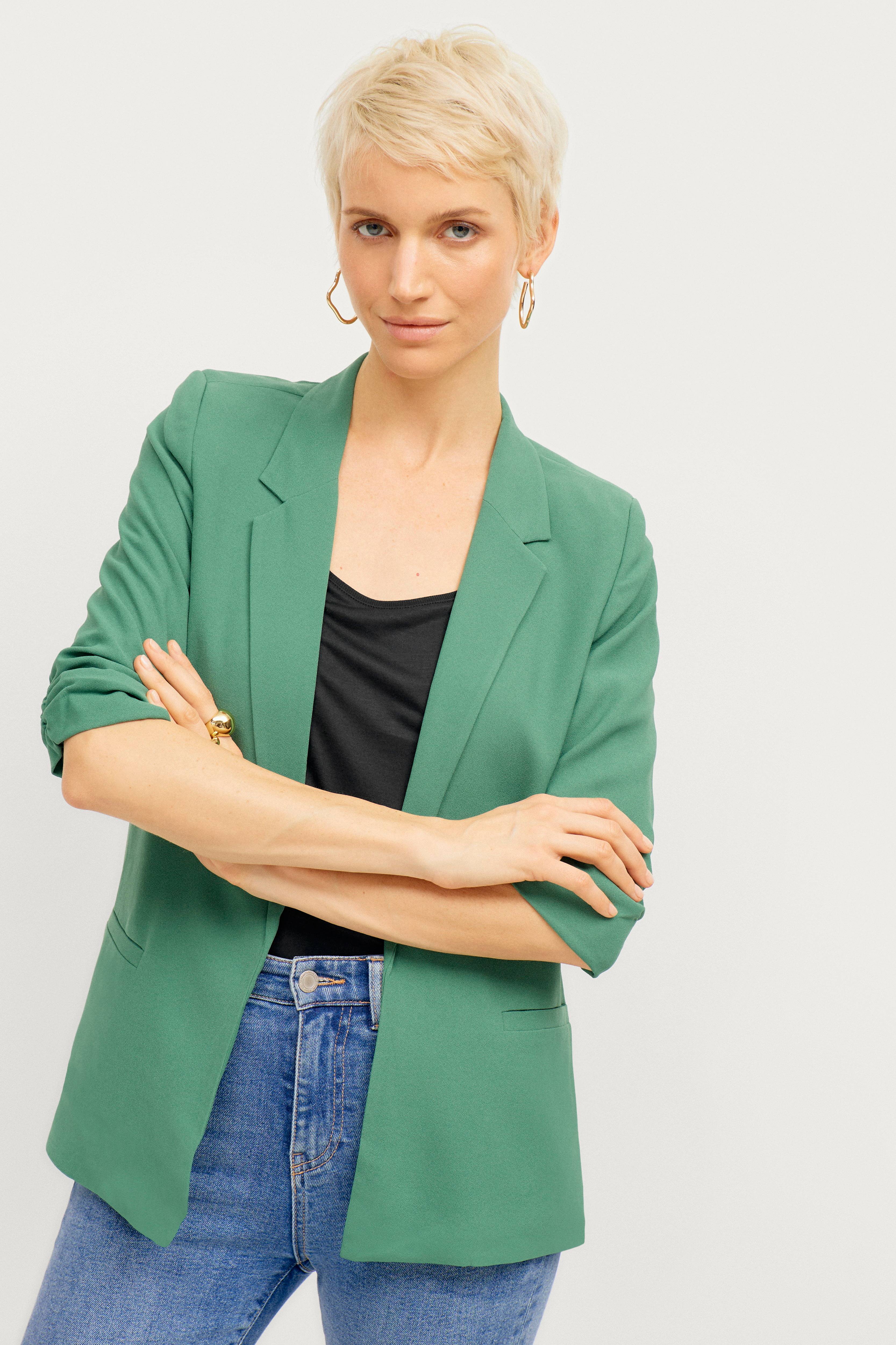 Dressjakke Shirley Blazer fra Soaked in Luxury i mykt materiale. Rett modell som er åpen foran. 3/4-lange ermer med rynker i ermekanten. To lommer foran. Lengde ca. 67 cm i str S.
