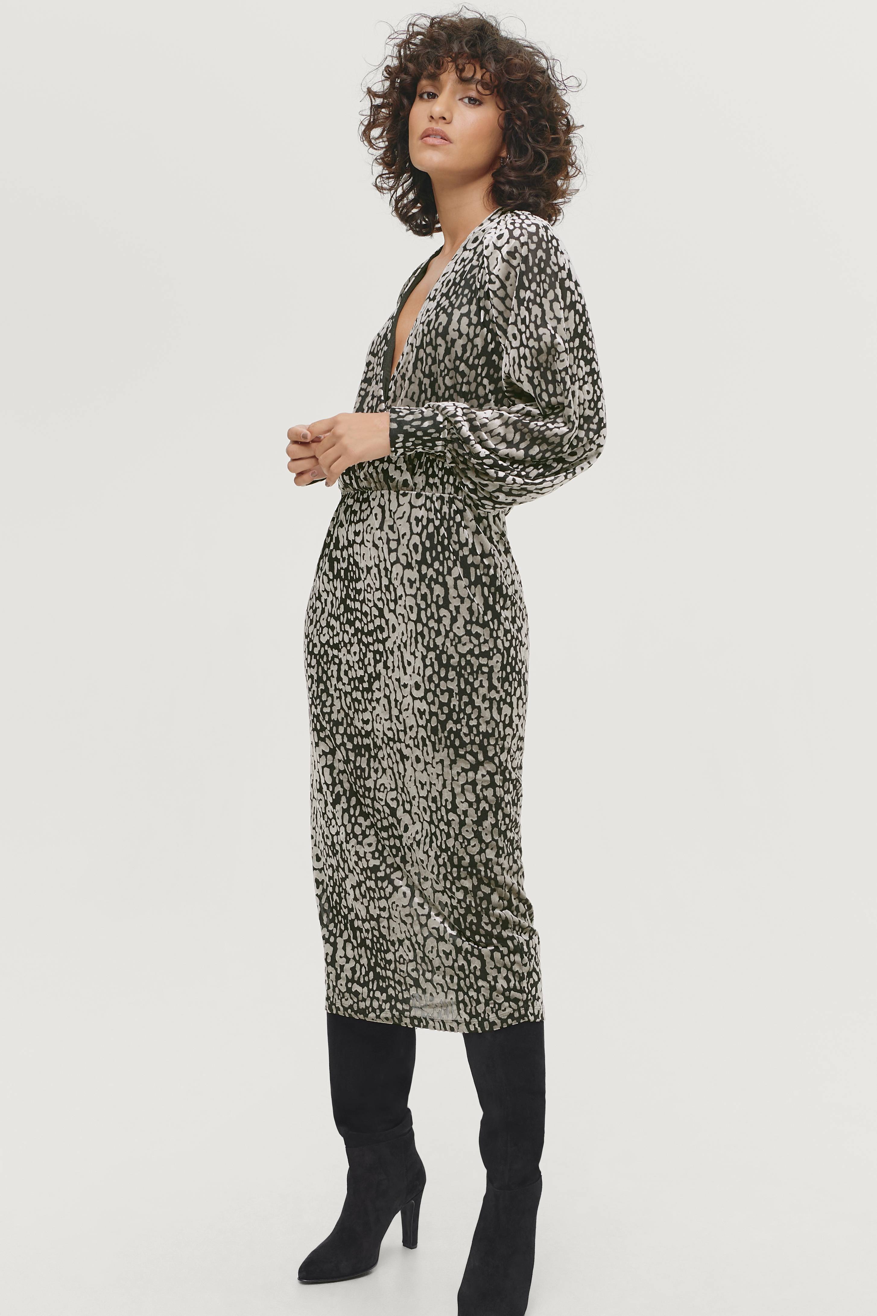 Kjole slKamiko Dress LS fra Soaked in Luxury i trikot med fløyelsmykt mønster. V-utringning i omslag foran, elastisk midje og figurnært skjørt. Vide ermer med vrangbord og knapp i ermekantene. Rynket halsringning bak. Fôret. Lengde ca. 118 cm i str. S.