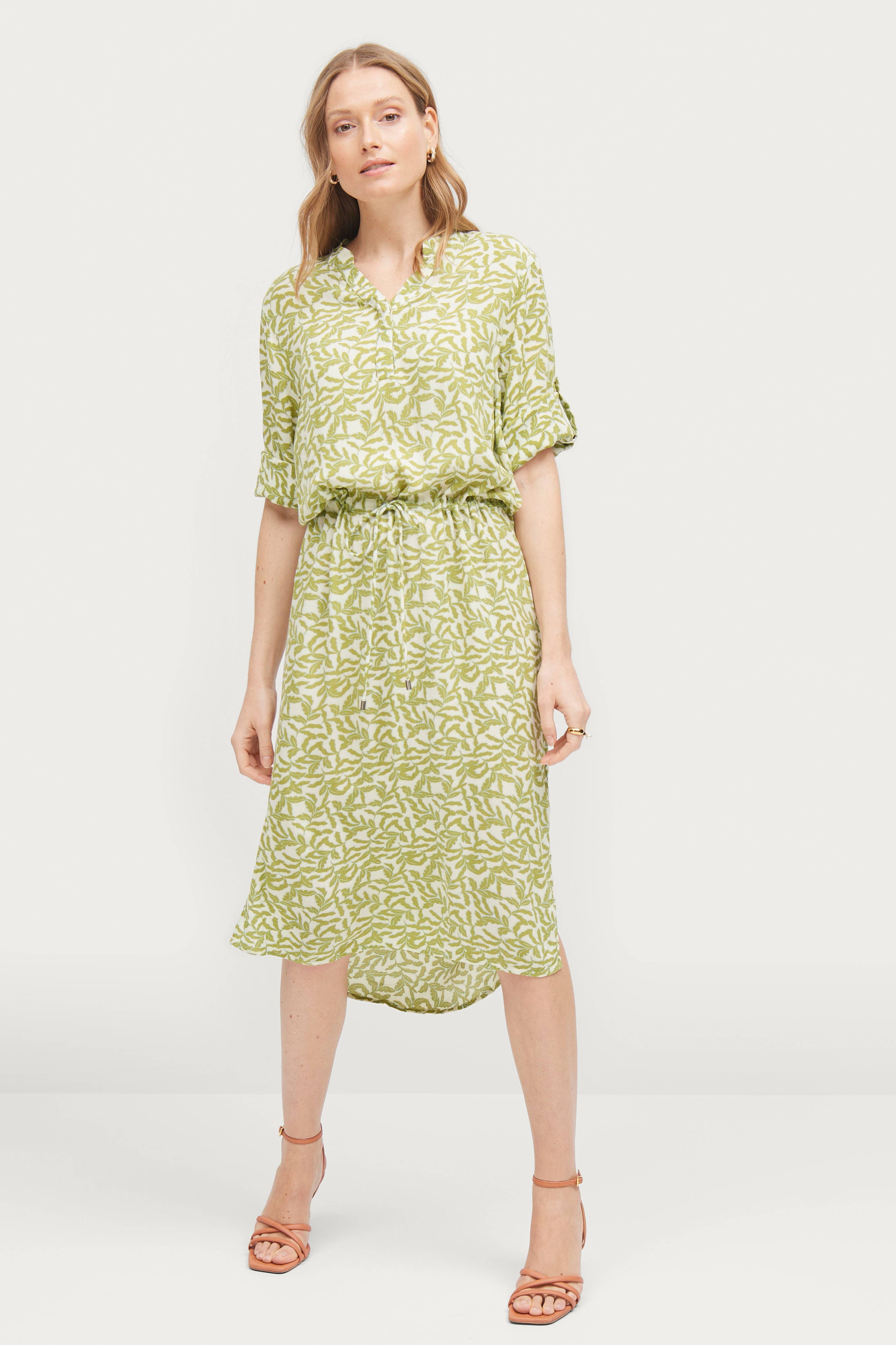 Kjole Zaya Dress fra Soaked in Luxury. Utsvingt modell med ledig form, og snor og knyting i midjen. Rund hals med en liten kragekant samt V-utringning foran og kort knappestolpe med skjulte knapper. Vide, 3/4-lange ermer med innvendig knappestolpe for oppbrett. Vevd crêpekvalitet med mykt fall. Lengde foran ca. 115 cm og bak ca. 129 cm i str M.