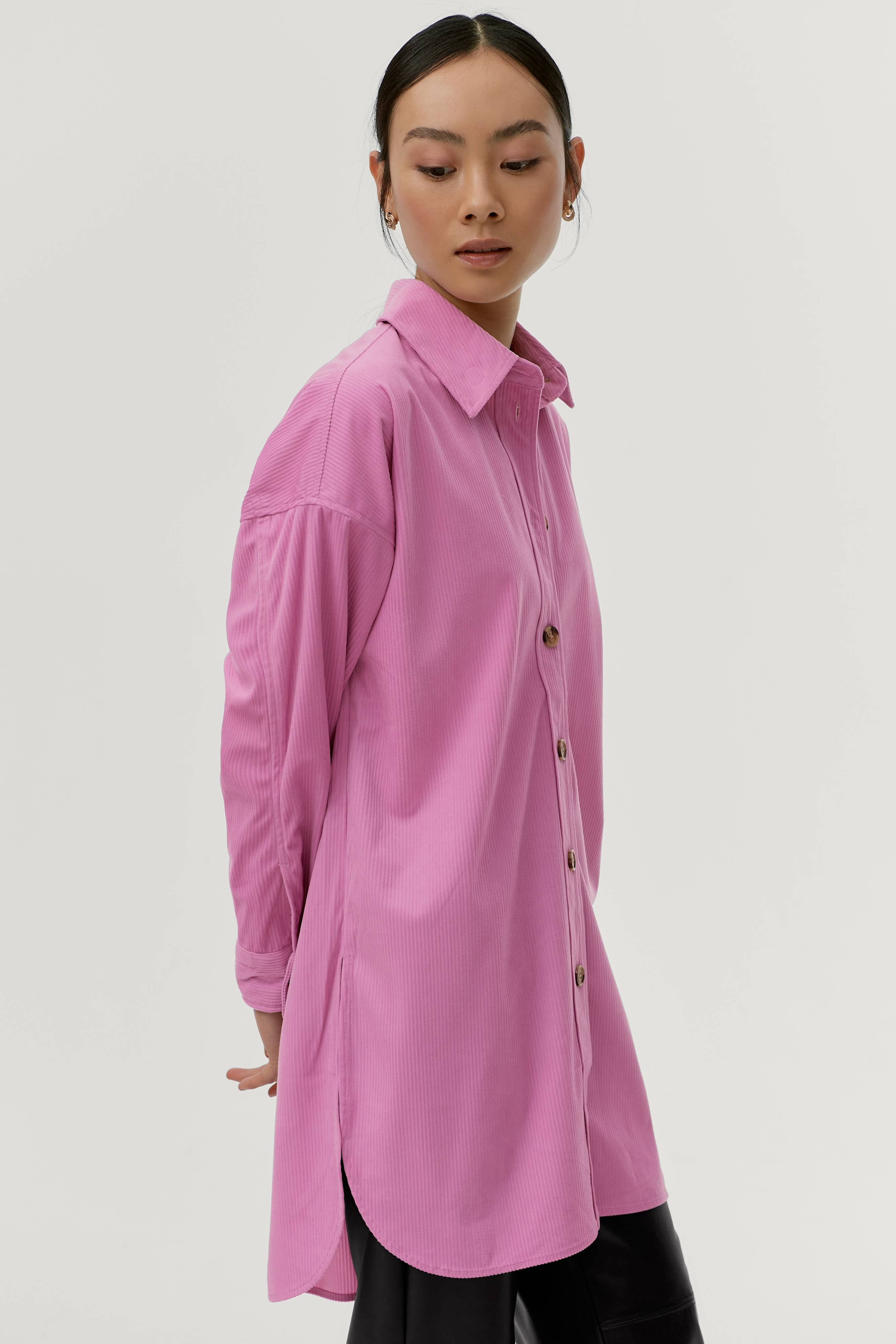 Rett oversizemodell i kordfløyel med krage og knapping med store knapper foran. Avskåret bærestykke med lagt legg bak, mansjett i ermekantene samt rundskåret nederkant med splitt i sidene. Lengde ca. 90 cm i str. S.