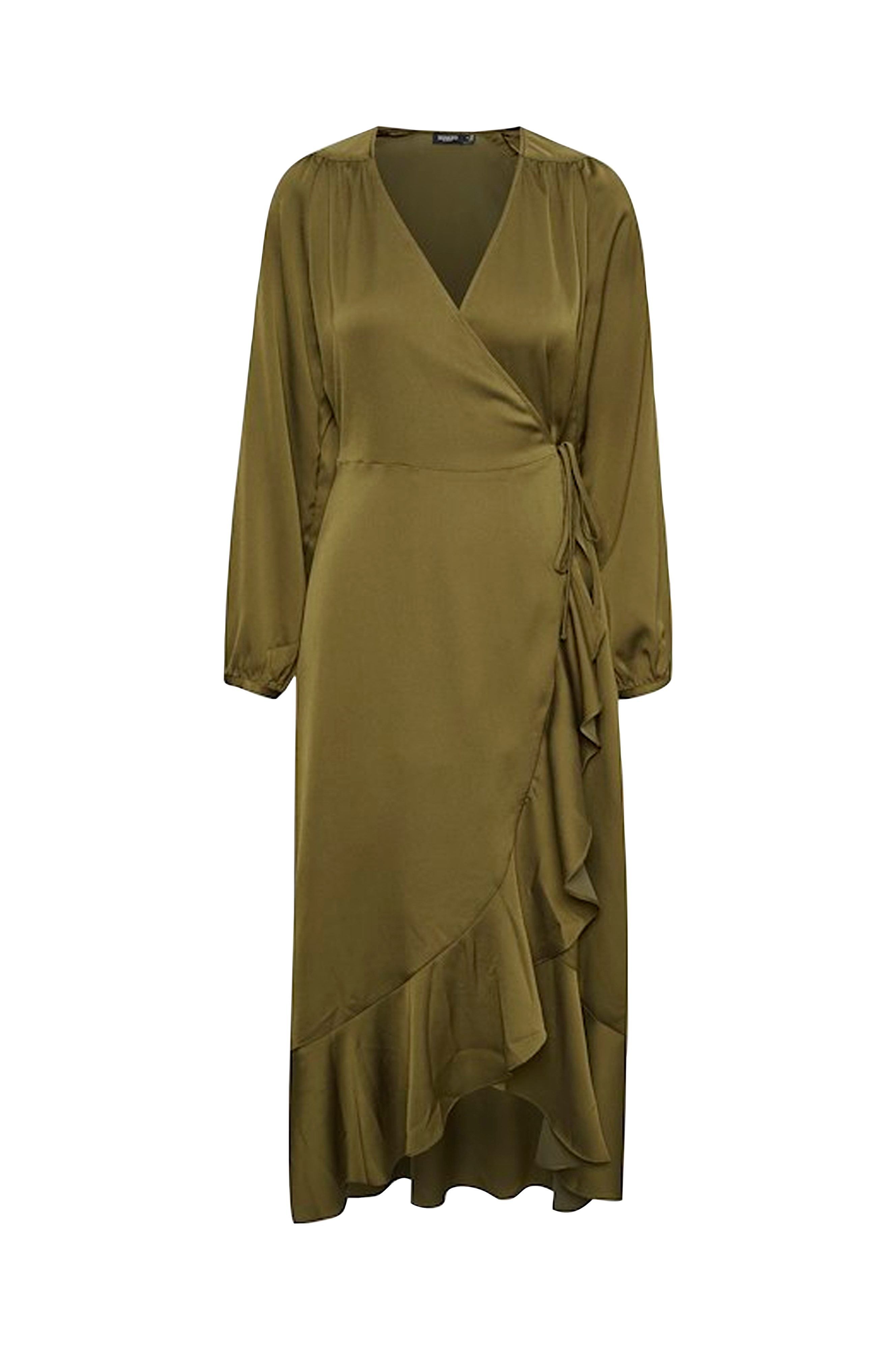 • Omslagsdesign • Langt erme med knapp i ermeslutten • Volang på skjørtet • Kvalitet med lysskinn • Lengde: 131 cm i størrelse S • Produktet inneholder gjenvunnet materiale som er brukt for å redusere mengden avfall, samtidig som det ikke er brukt nye ressurser.