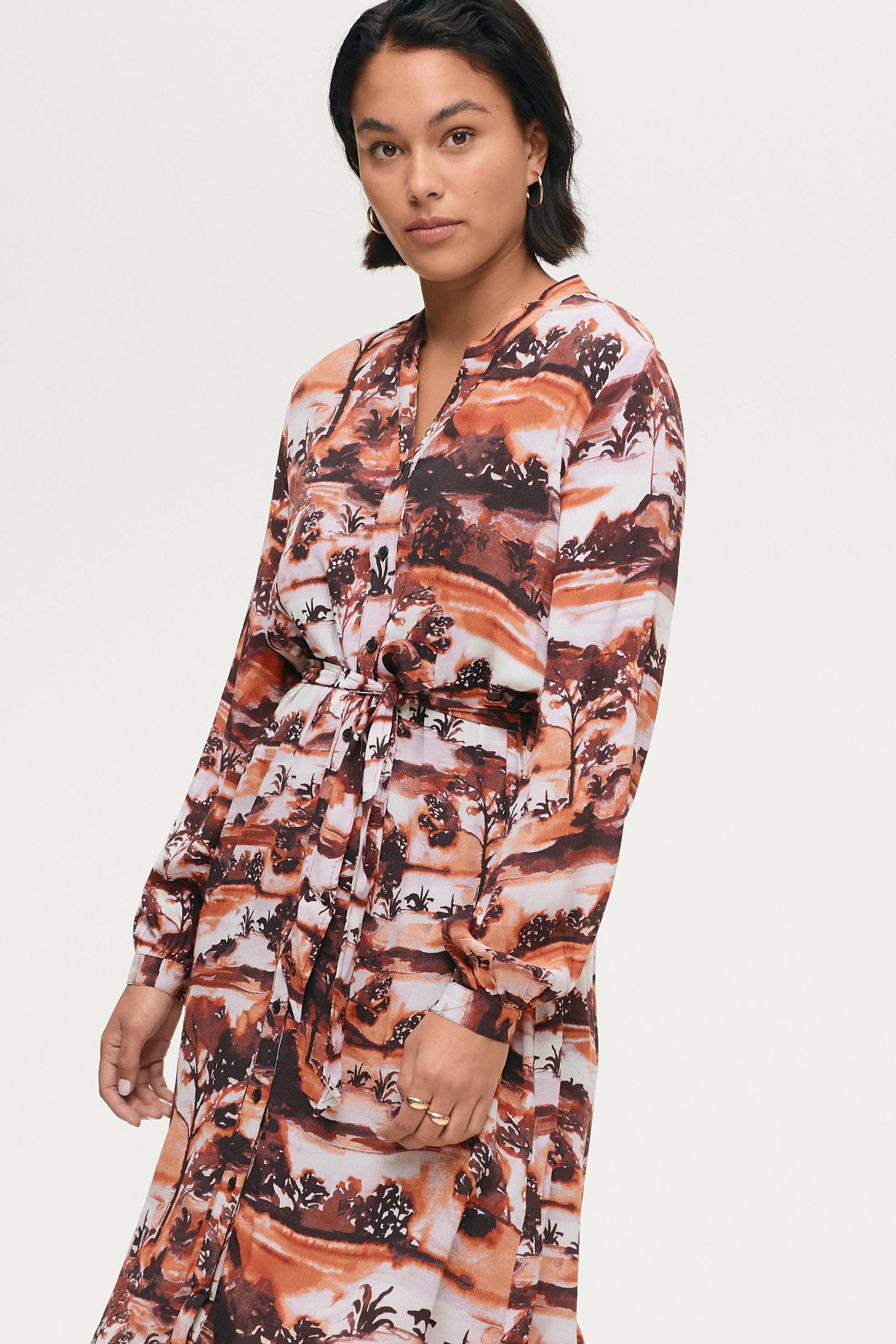 Skjortekjole slEndzela Dress LS fra Soaked in Luxury. Lett utsvingt modell i vevd, mønstret kvalitet med mykt fall. Liten kant i halsen og V-utringning foran som går over i knappestolpe hele veien ned. Hemper med knytebelte i midjen, og lange ermer med mansjett i ermekantene. Lengde ca. 113 cm i str S.