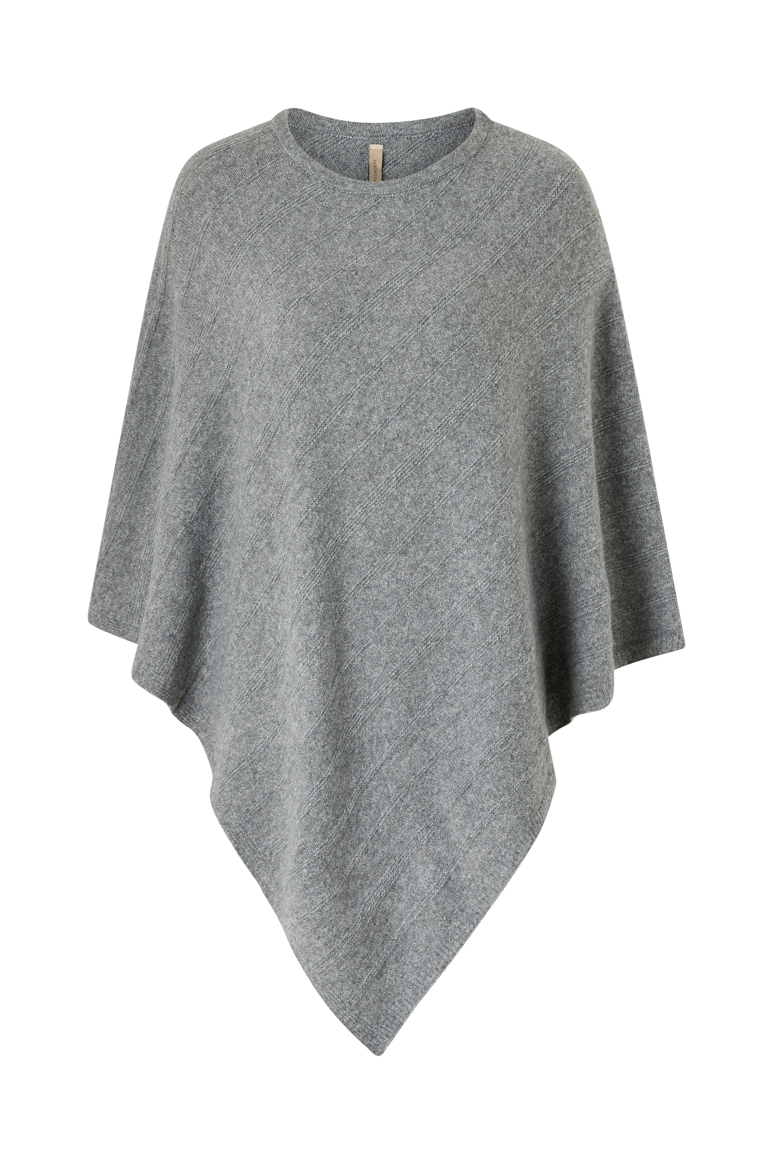 • Finstrikket poncho med diskret glitter rundt• Ribbestrikk på toppen• Asymmetrisk hem