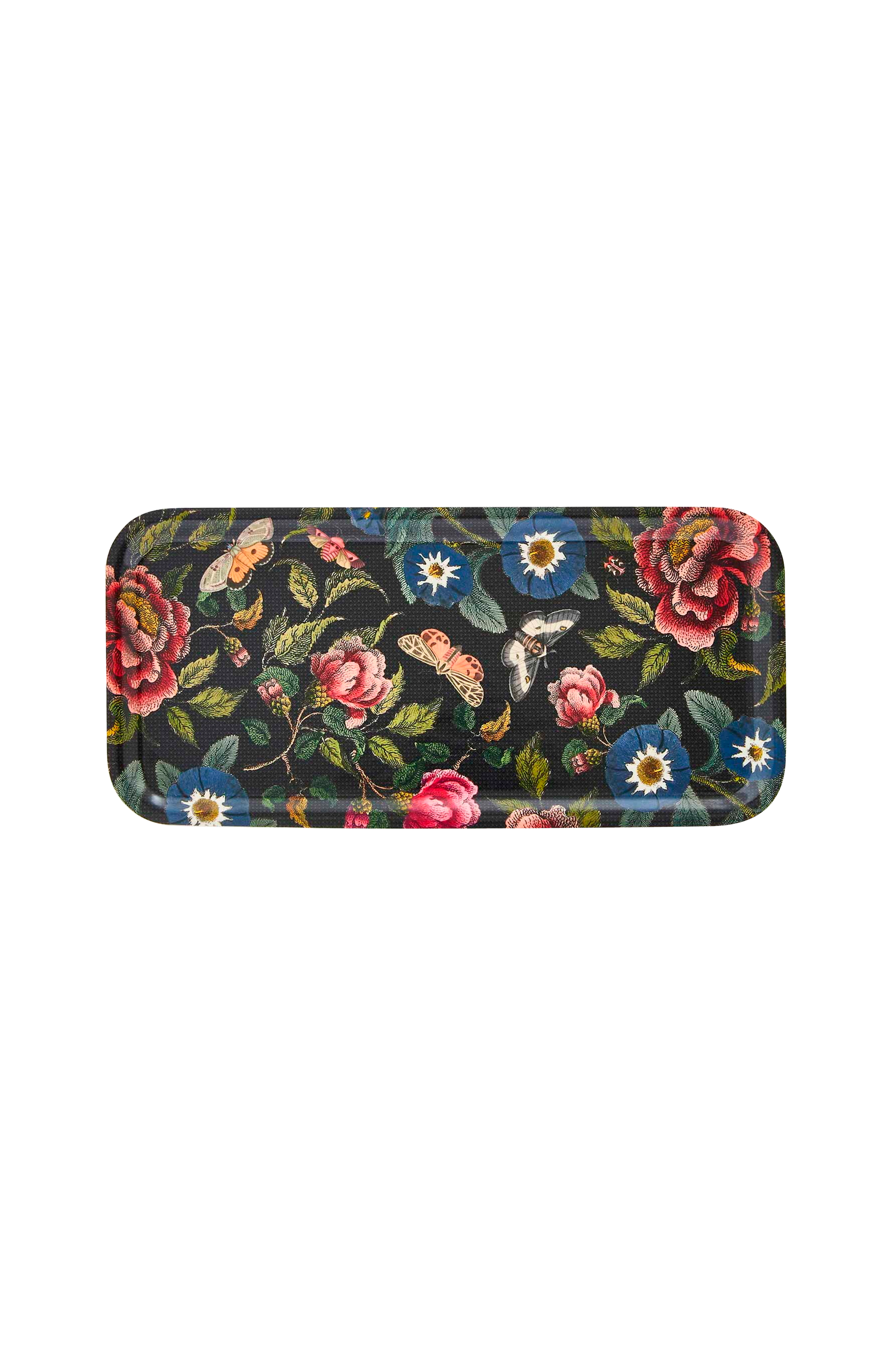 Rektangulært brett fra Spodes Creatures of Curiosity-kolleksjon med et vakkert, svart blomstermønster med morsomme dyreinnslag. Produsert av slitesterk bjørk perfekt for hverdagsbruk.