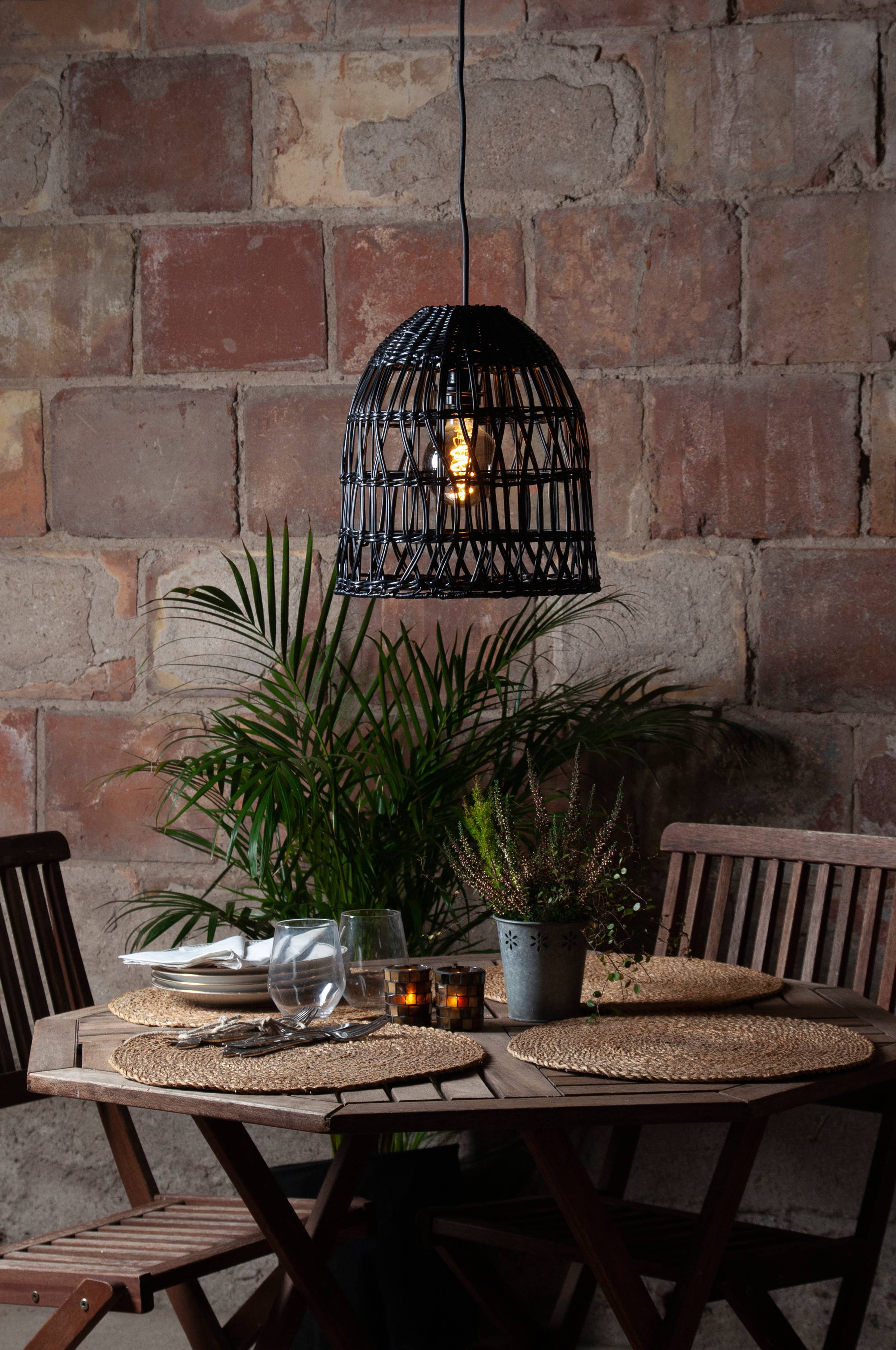 Lampeskjerm i kunstrotting for utendørsbruk. Høyde 33 cm og diameter 30 cm. 5 meter svart oppheng med E27-sokkel inkludert. IP44. Lyspære ikke inkludert.