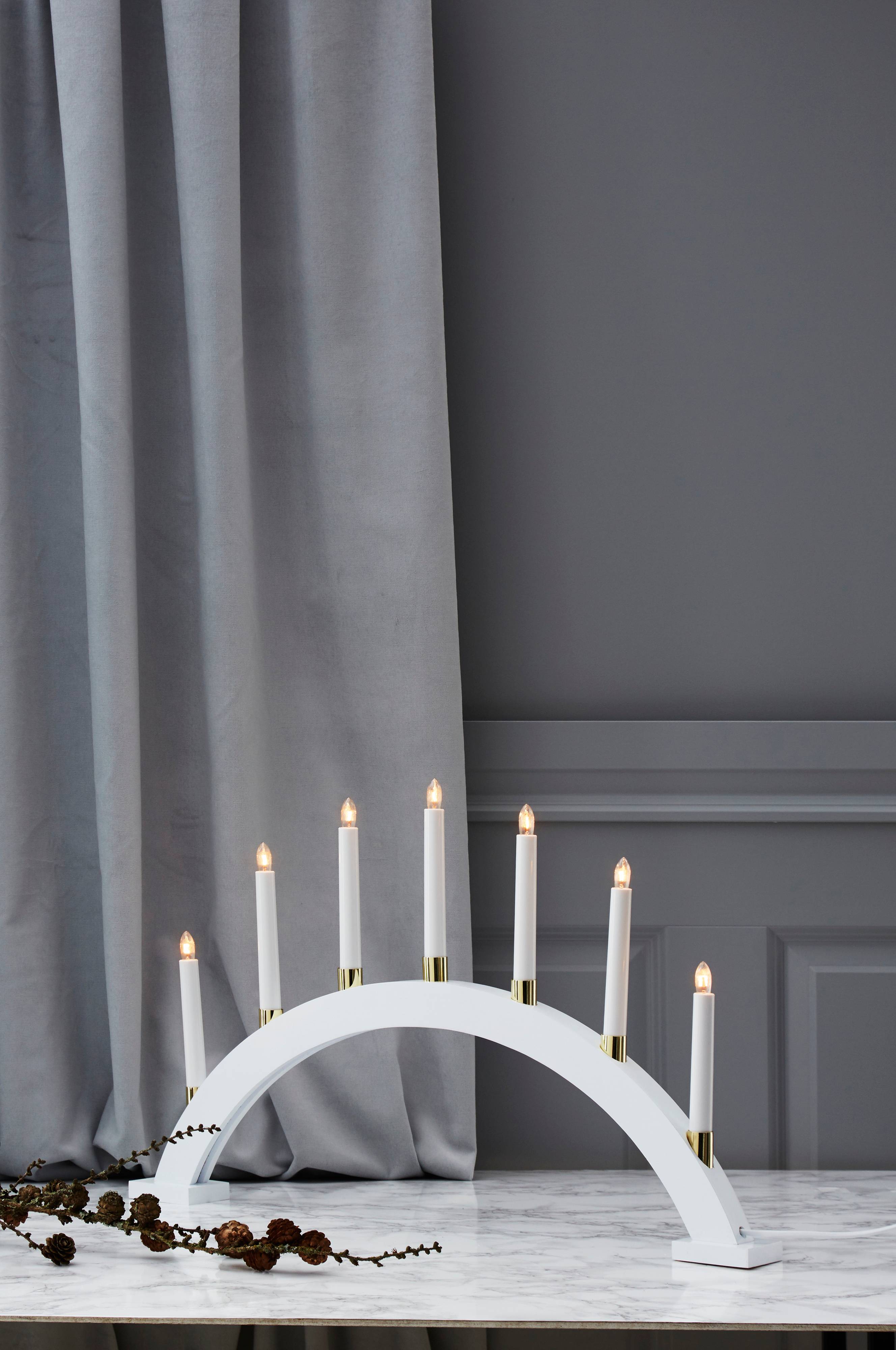Bueformet lysestake av tre med messingbelagte sokler. Fin adventslysestake å pynte med til jul. Lysestaken har 7 sokler og pærene inngår. Lyspærer inkludert. Dybde:6 cm, høyde:40 cm, bredde:63 cm.