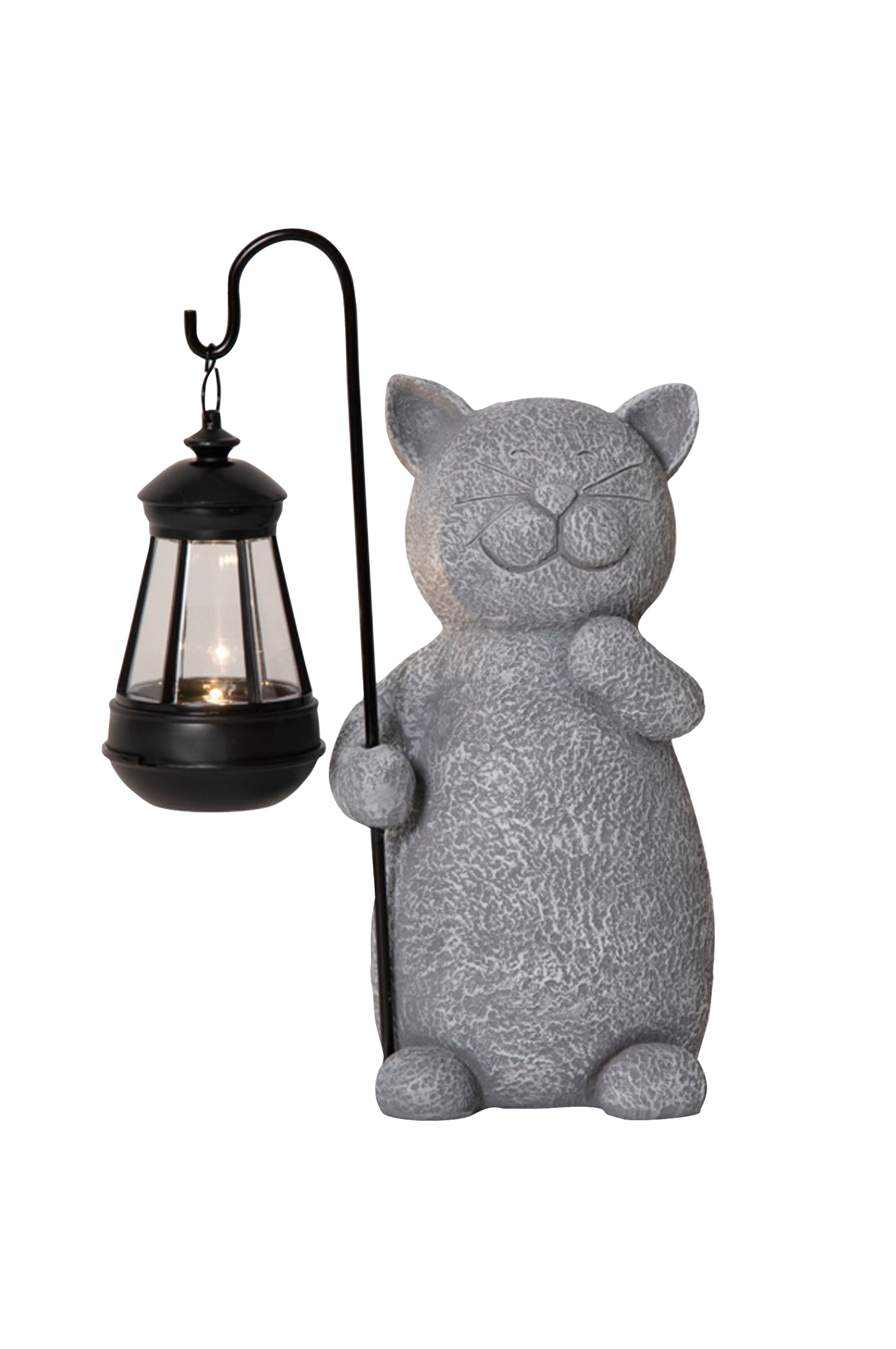 Solcelledrevet dekorasjon laget av polyresin som imiterer granitt. En katt holder en lykt som skinner med et varmt hvitt lys. Det medfølgende batteriet lades av solen om dagen og slår på lyset når det blir mørkt.