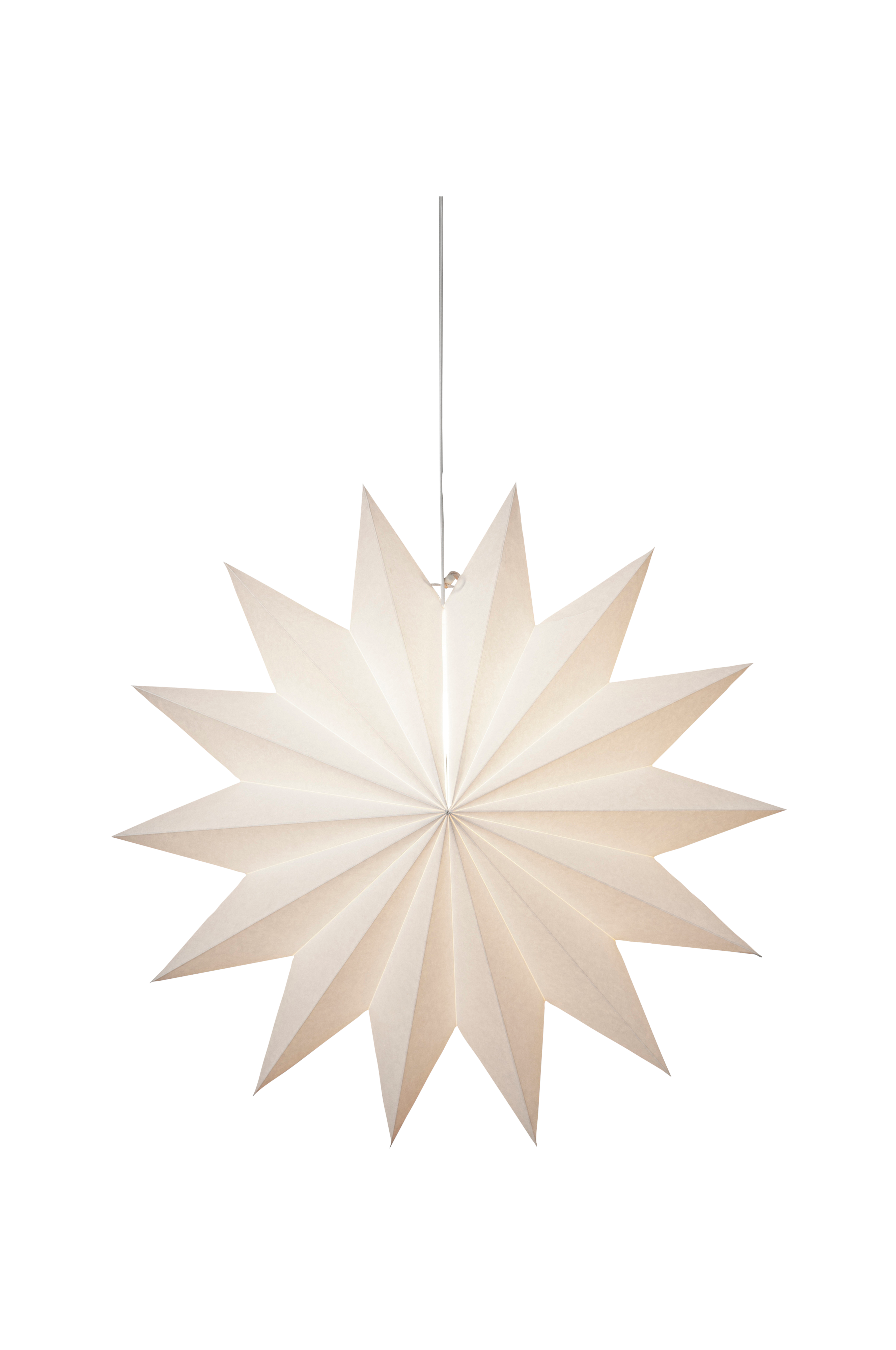 Hvit papirstjerne med 14 spisser. Magisk stjerne til å henge i vinduet eller lene seg mot en vegg. Et elegant bånd følger med for å gjøre det enklere å henge opp stjernen. Stjernen sprer stemning og gir hjemmet den spesielle advents- og julestemningen. Kombiner med en snor etter eget valg. Diameter 60 cm.