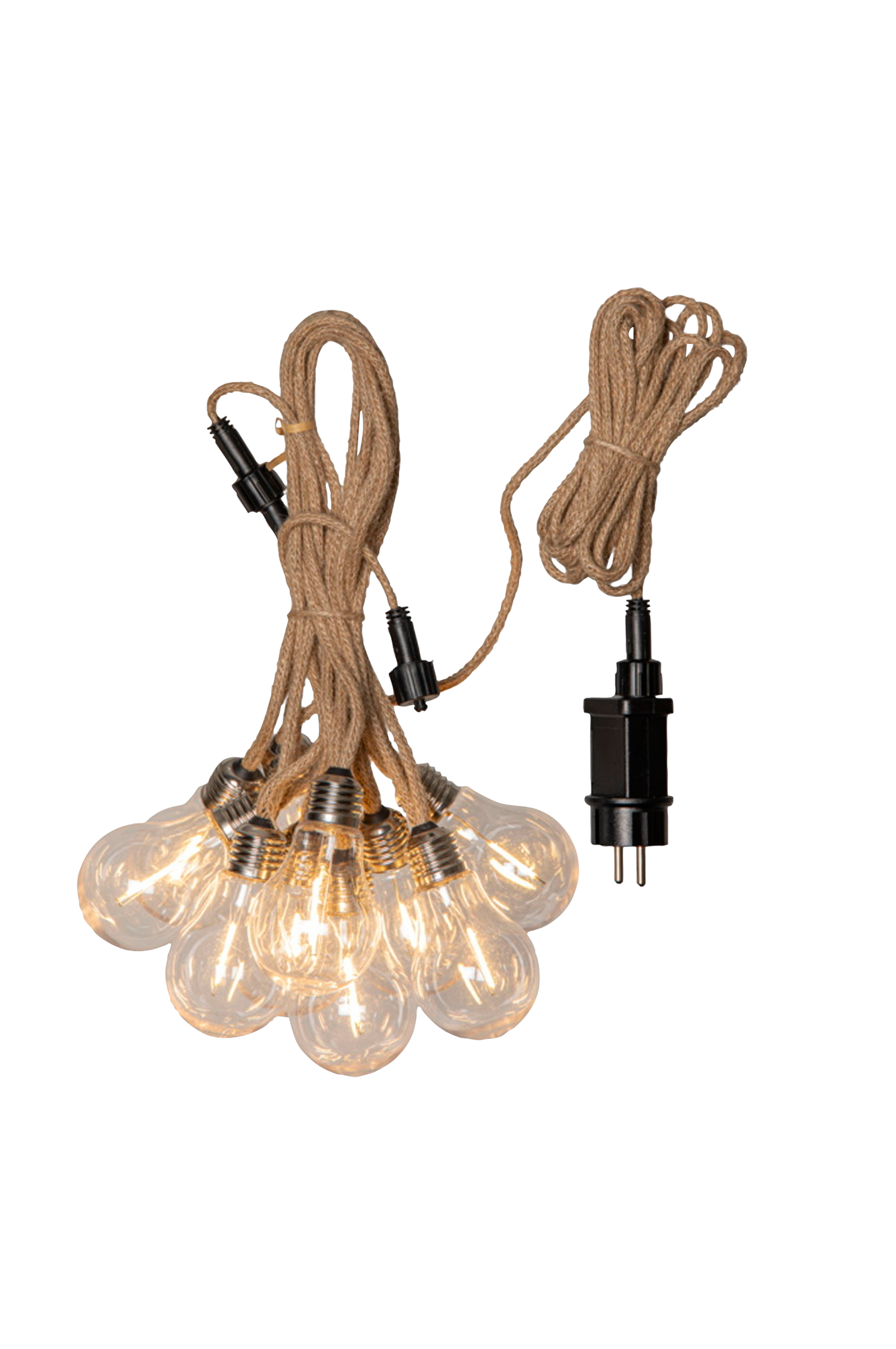 Partylyskjede med dekorativ kabel kledd med beige juteduk. 10 deksler med varmhvite led-lys gir et behagelig og vakkert lys i hagen, på balkongen eller på terrassen. Herlig lyskjede å dekorere med til hverdag og fest. Kan kobles sammen med maks 3 stk lyskjede av art. 476-90, lysstyrken vil avta litt ved tilkobling av 2 eller 3 stk. Transformatoren, som er ip44-klassifisert, har en innebygd timer. Timerfunksjonen er på når knappen på transformatoren lyser grønt. For å justere på og av, trykk på knappen i 3-4 sekunder.