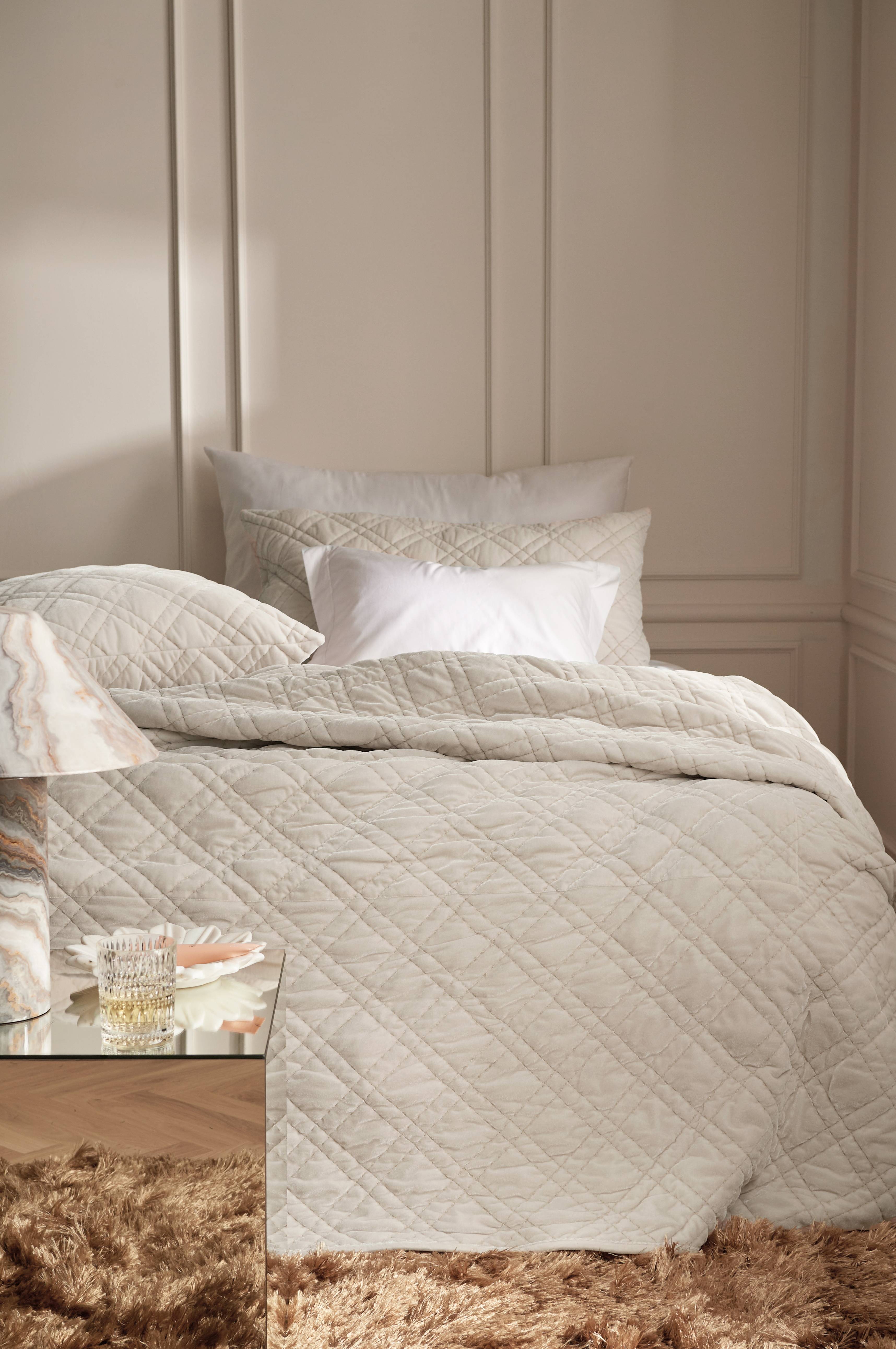 Quiltet sengeteppe med forside i nervøs fløyel med fin glans. Bakside av bomull. Fyll av 120 g polyester.