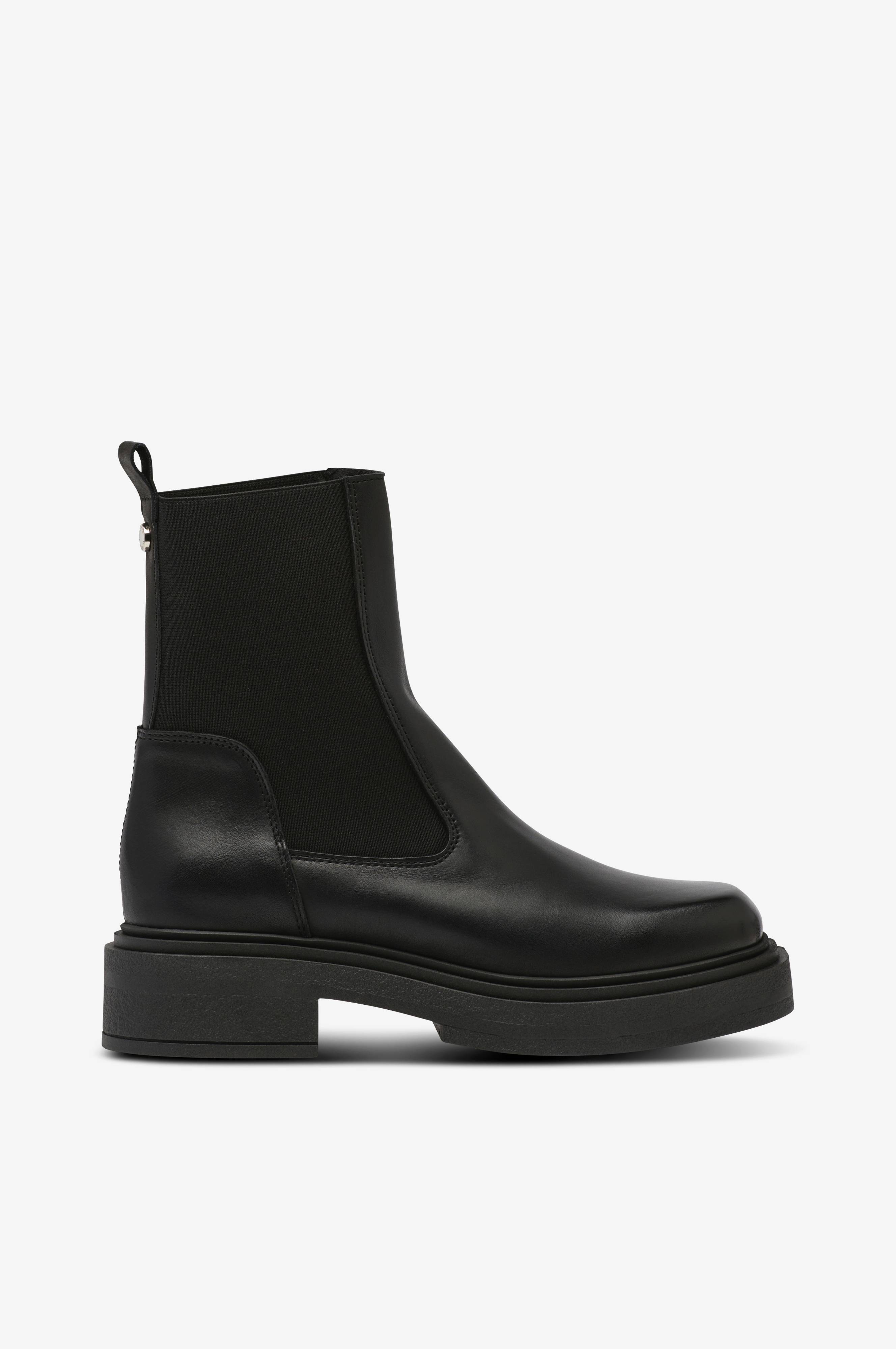 • Boots i skinn• Brede elastiske paneler på begge sider av skaftet• Draflik bak på skaftet• Firkantet tåform• Yttersåle i gummi• Skafthøyde: 16 cm i størrelse 37• Hælhøyde: 4 cm