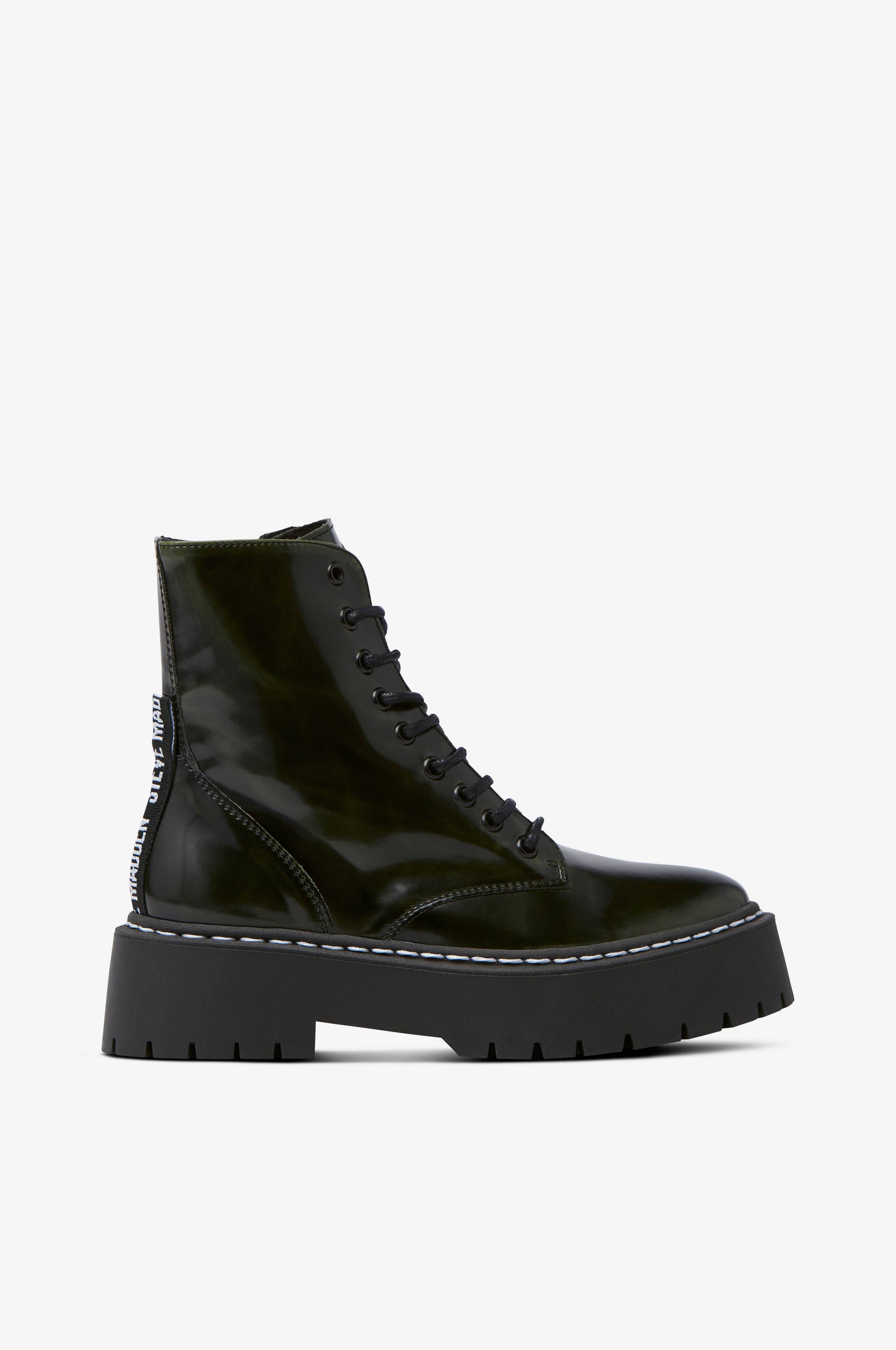 Støvler Skylar Bootie fra Steve Madden. Snøring foran og glidelås på innsiden av skaftet. Høy såle med grov yttersåle og pyntesøm rundt. Påsydd logobånd med hempe bak. Tekstilfôret. Skafthøyde ca. 14 cm. Hælhøyde ca. 4,5 cm. Sålens høyde er ca. 3,5 cm.