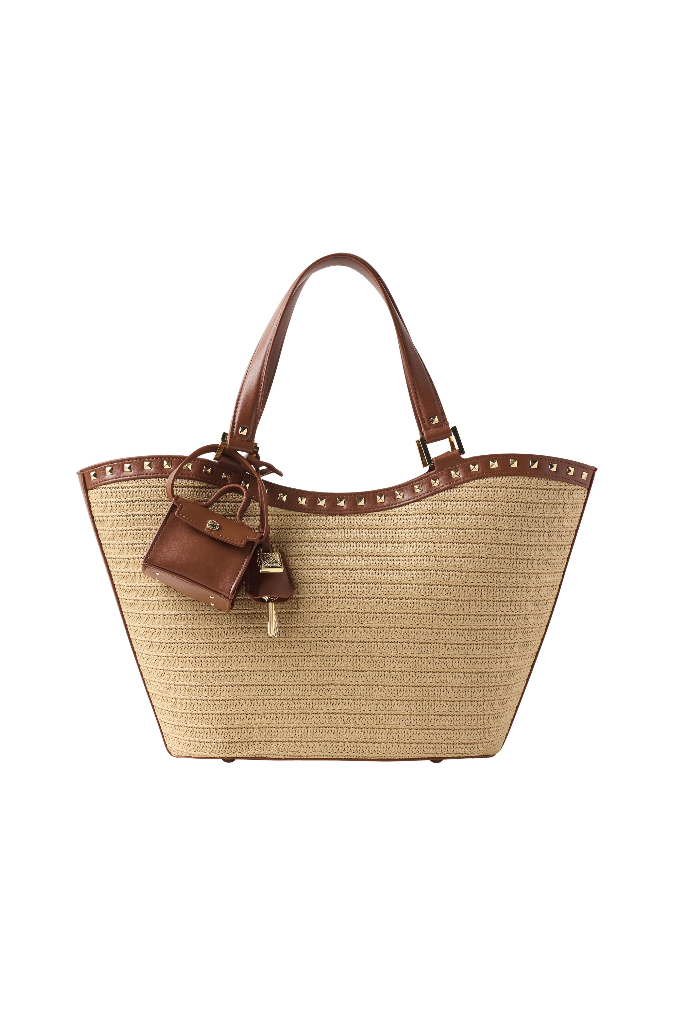 • Vesken i papirstrå med tekstilfôr • Dekorative stifter i gullfarget metall • Detaljer i skinnimitasjon • Lukning med magnetknapp • En innvendig lomme med glidelås • En åpen lomme • To bærehåndtak • En lommebok er inkludert. Lommeboken lukkes med en trykknapp og har 3 store åpne rom, 1 rom med glidelås og 6 kortplasser