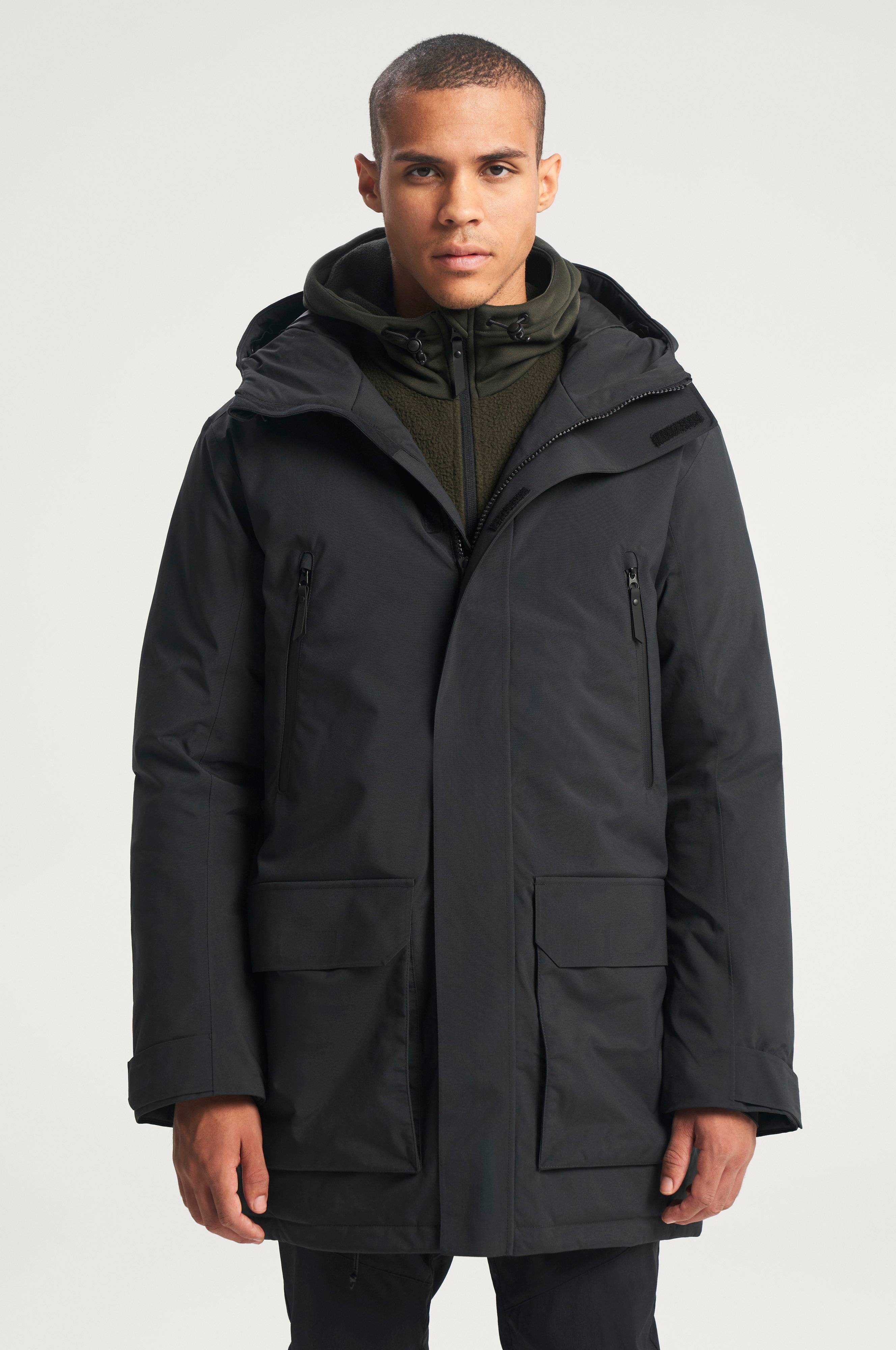Vattert Parkas fra Studio Total Active. Vind• og vanntett ytterstoff med 3000 mm vannsøyle og pusteevne opptil 3000 g/m2/24 t. Sømmene på utsatte områder er teipede for at vann ikke skal trenge gjennom. Normal passform. Jakken lukkes med toveisglidelås og en beskyttende vindstolpe med borrelås. Hette med justerbar snøring og avtagbar fuskepels. Børstet polyester på innsiden av kragen og ved haken. To brystlommer som lukkes med vanntett glidelås, samt to lommer med lommeklaff. Tre innerlommer; to åpne lommer i mesh og en som lukkes med glidelås. Trikot i ermekantene.