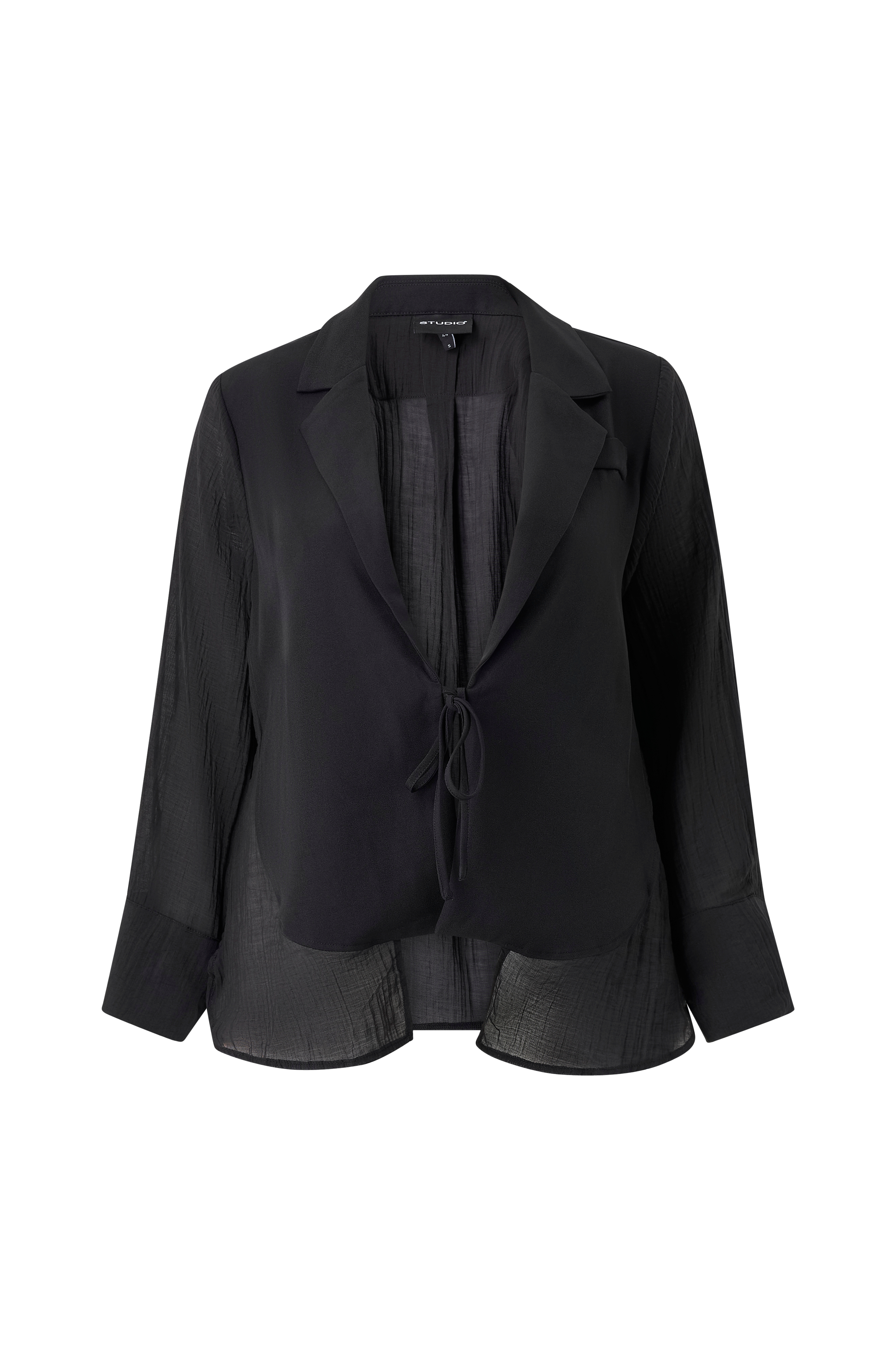 • Blazer med krage og jakkeslag• Lange, semitransparente ermer• Mansjetter i ermeslutten• Snørebåndlukking• En jukselomme• Semitransparent stoff bakpå• Pluss-størrelser• Lengde: 71 cm i størrelse S