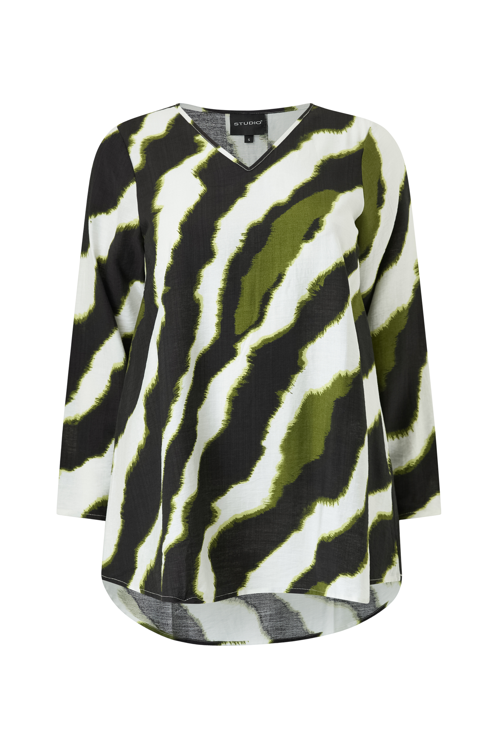 • Mønstret bluse i viskosemiks• Litt lengre modell• V-hals snitt• Lange ermer• Pluss-størrelser