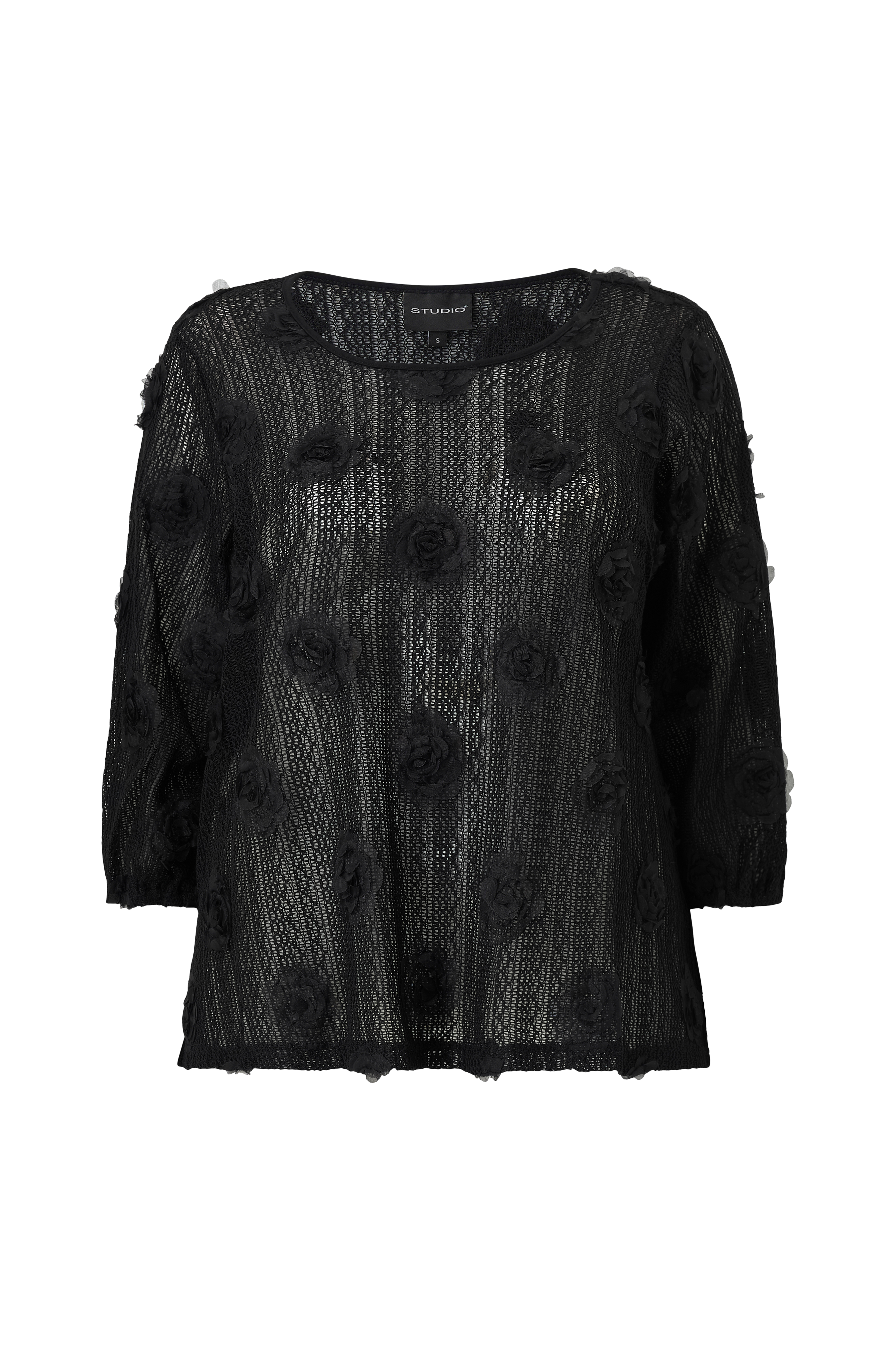 • Gjennomsiktig bluse med en åpent vev og påsydde blomster rundt• Løs passform• Rund hals• Ermer 3/4 lang med gummistrikk i ermeslutten• Pluss-størrelser