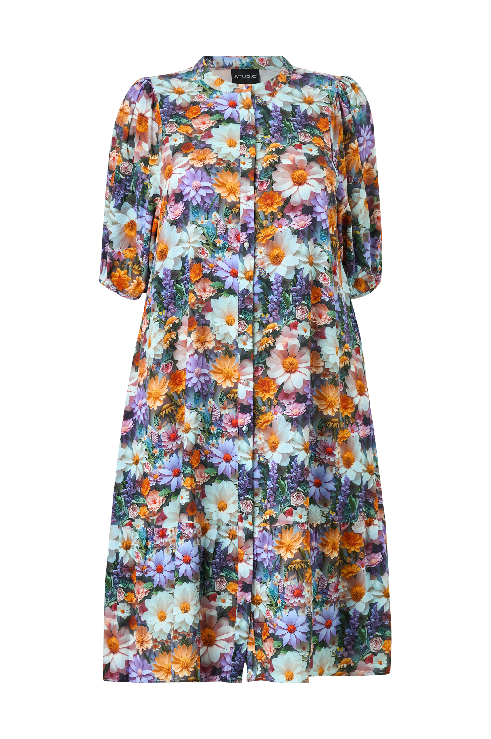• Blomstret kjole• Kledde knapper foran• Korte bobleermer• Lengde: 116 cm i størrelse S• Pluss-størrelser