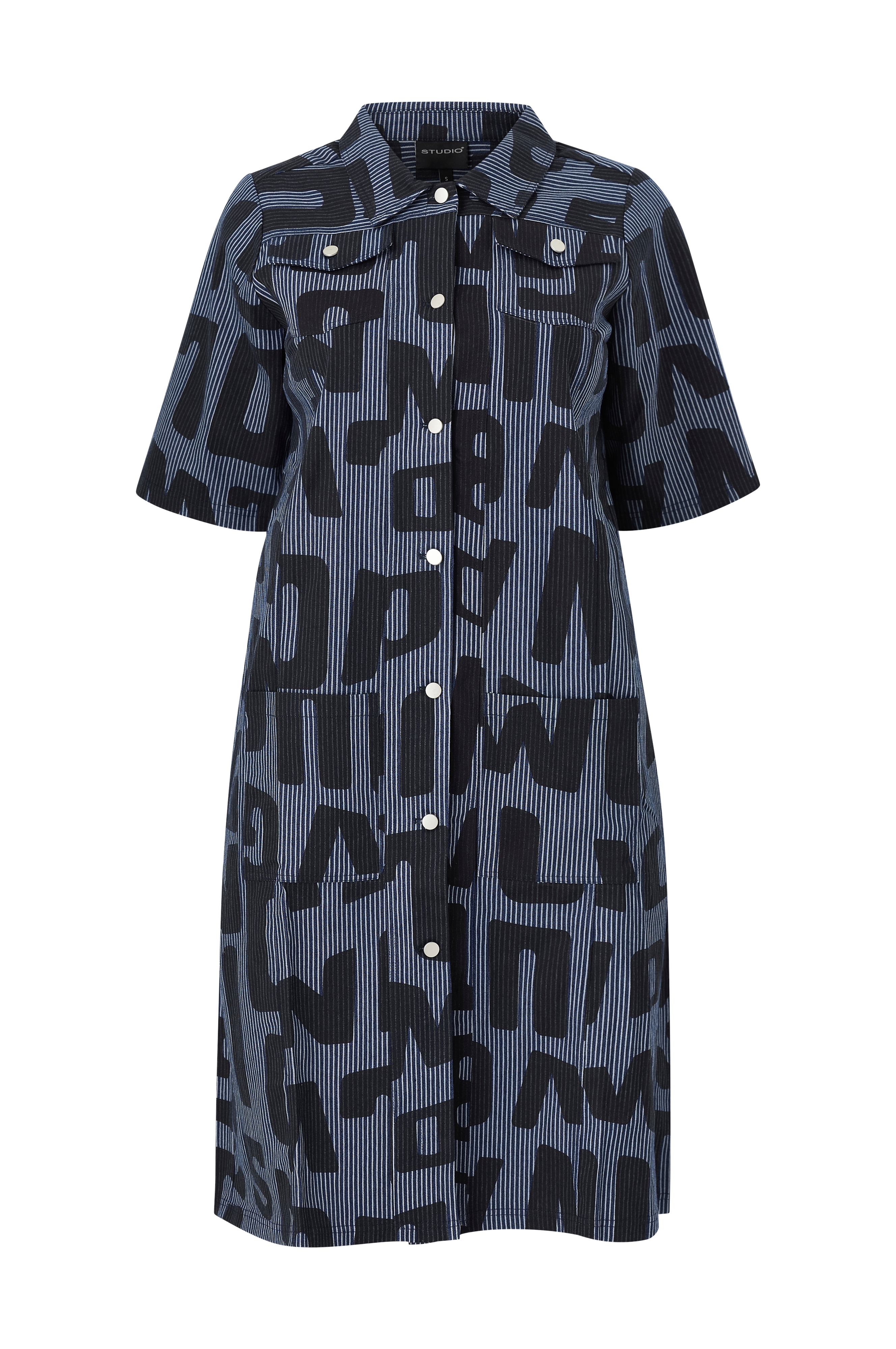 • Mønstret kjole i bomullsdenim med krage• Brystlommer med lokk• Knapper hele veien fram• Korte ermer• To lommer på bunnen• Åpne lommer på bunnen• Litt utsvinget modell• Lengde: 114 cm i størrelse S• Pluss-størrelser