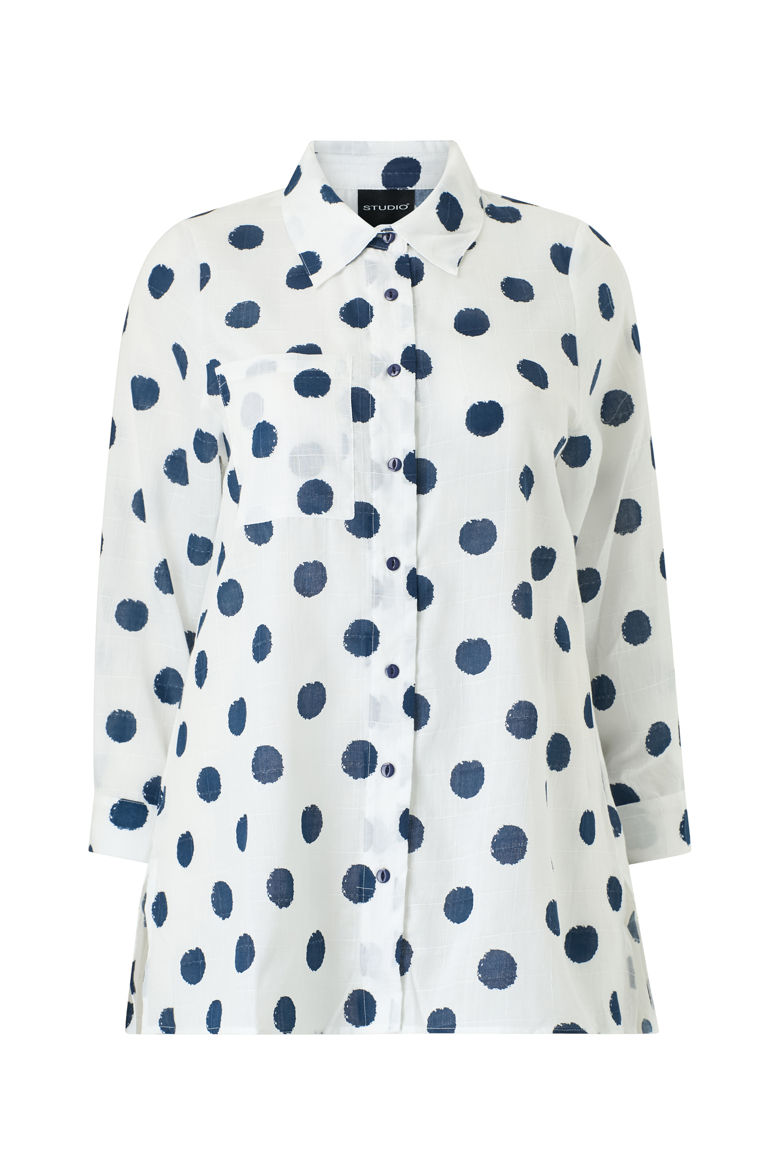 • Semitransparent tunika i bomullsblanding med en prikk• Knappelukking• En brystlomme• Skjær nede i sidene• Pluss-størrelser• Lengde: 85 cm i størrelse S