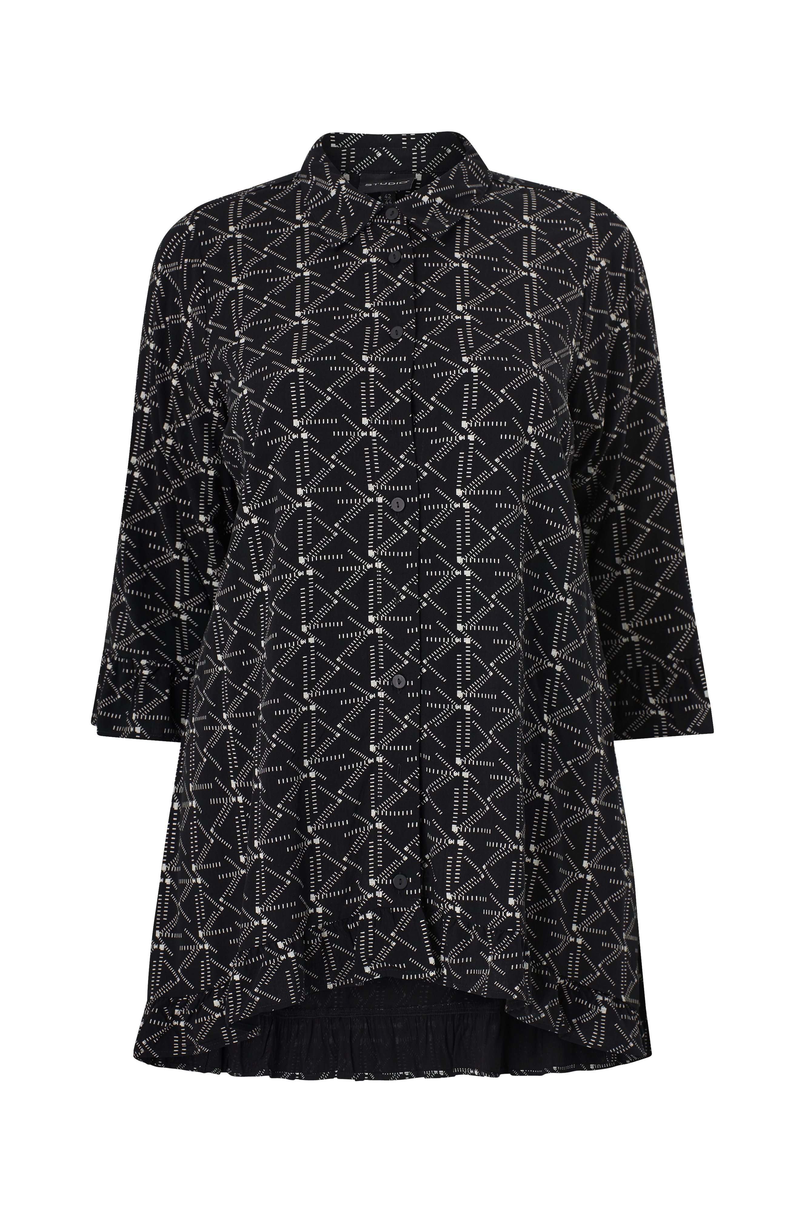 • Plusstørrelser• Utsvingt skjortemodell med liten krage• Knapper hele veien fram• Rett, bredt erme med volang i ermeslutten• Avrundet hem med liten volangkant• Lengde: 90 cm i størrelse 42/44