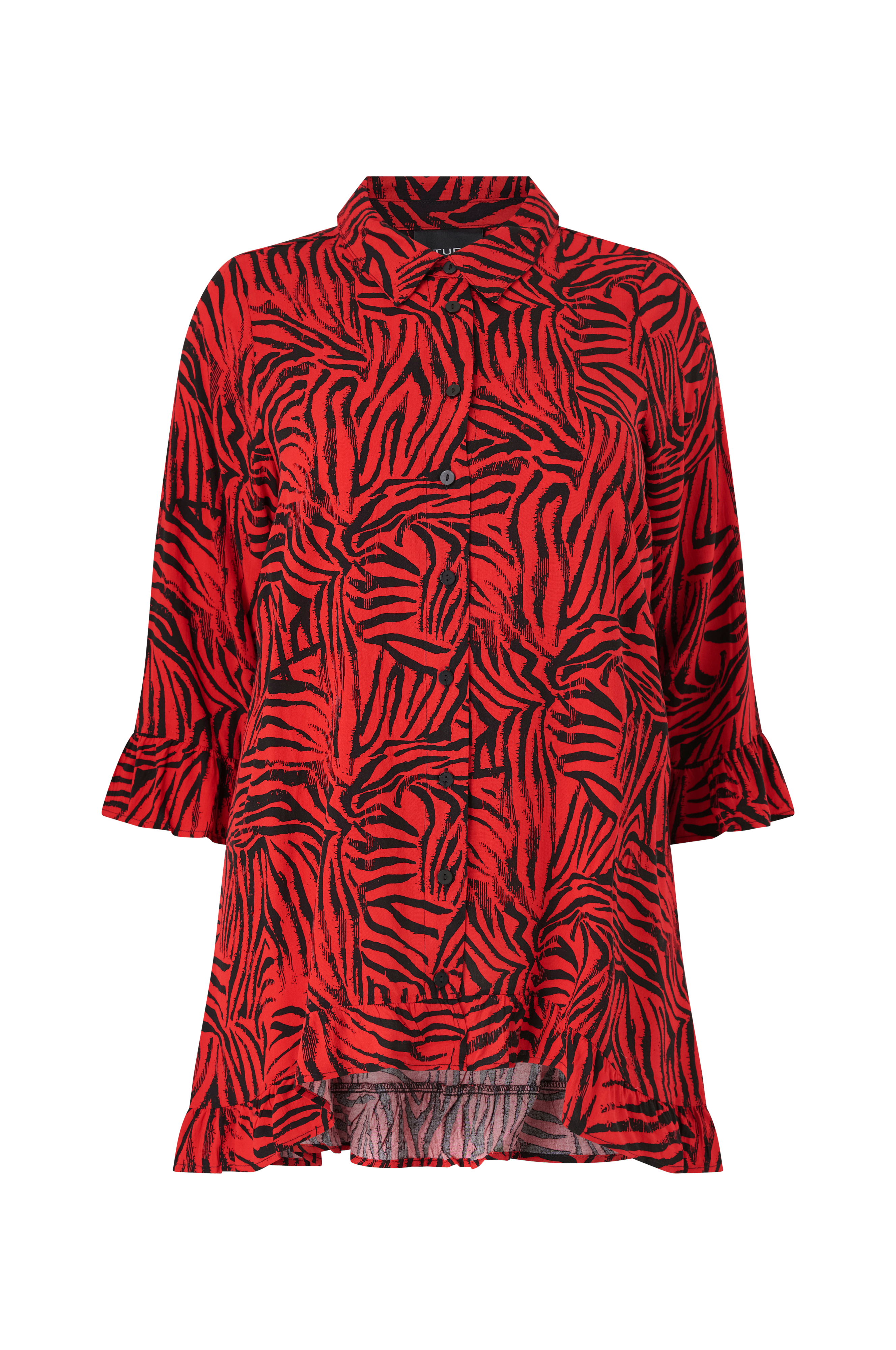 • Tunika i viskose med trykket mønster• Knapper• Volang i ermeslutten og i nedre kant• Litt lengre backing• Plusstørrelser• Lengde: 93 cm i størrelse S