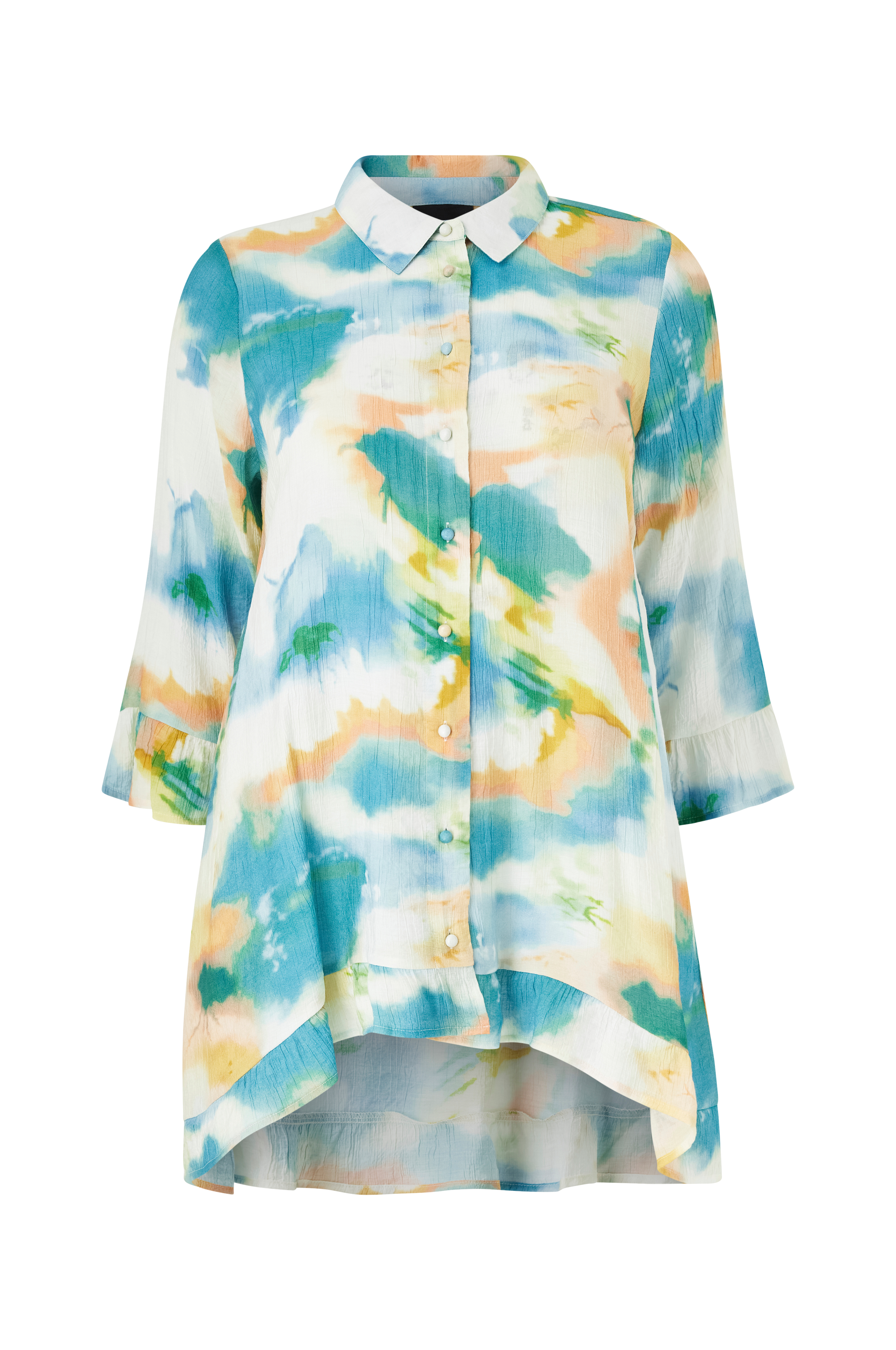 • Utsvingt modell i krepp• Liten krage• Kledde knapper hele veien fram• Langt, rett erme med volang i ermeslutten• Liten volang i nedre kant• Lenger backing• Lengde: 92 cm i størrelse 42/44